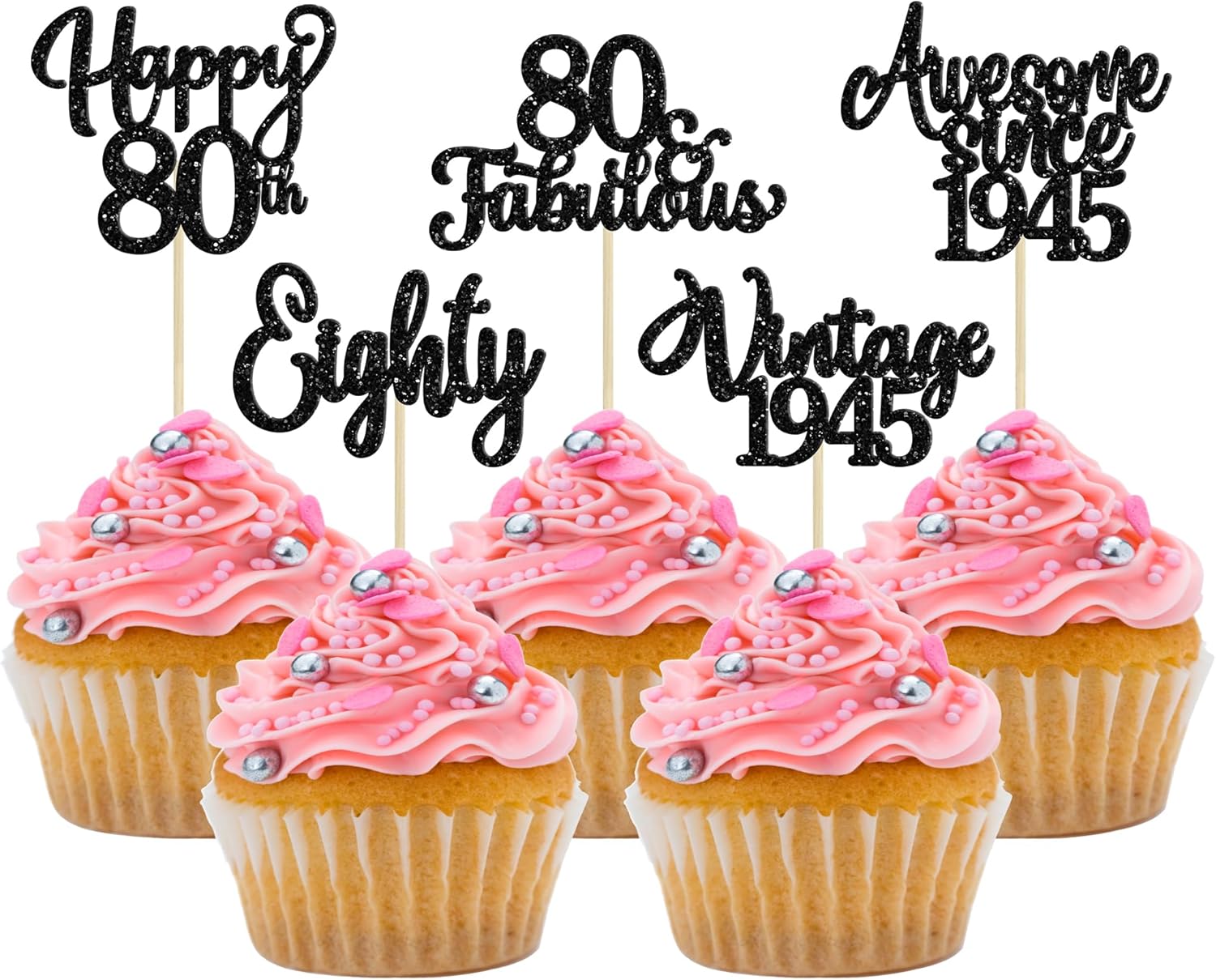 30Pcs Happy 80th Birthday Cupcake Toppers Glitter Awesome Since 1945 Eighty 80 Fabulous Vintage 1945 Cupcake Picks for 80th Birthday Anniversary Retirement Party Cake Decorations Supplies Black