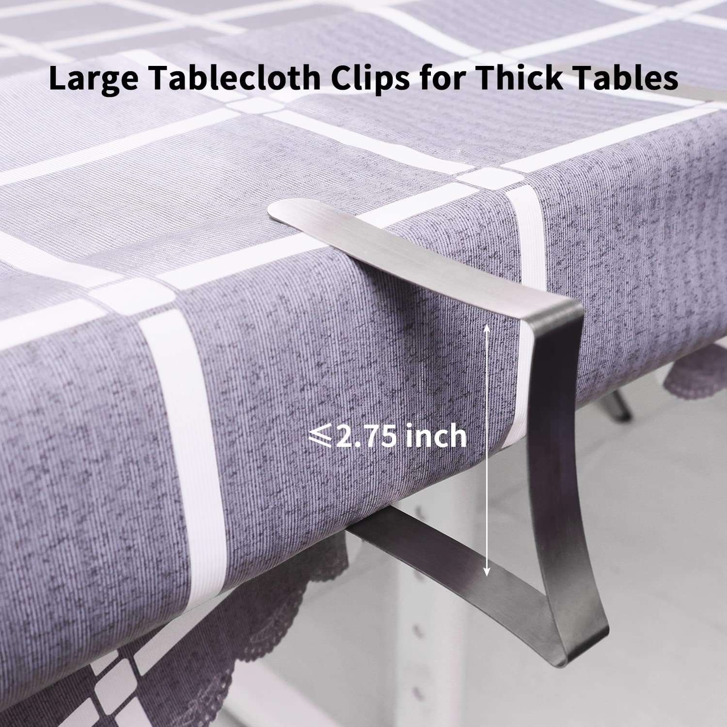 - Detail of Size: The height of table cloth holders is 2.95 inch and it can be opened to 2.75 inch to clip tablecloth, so these table clips are suitable for tables less than 2.75” thickness, otherwise the clips may pop out
