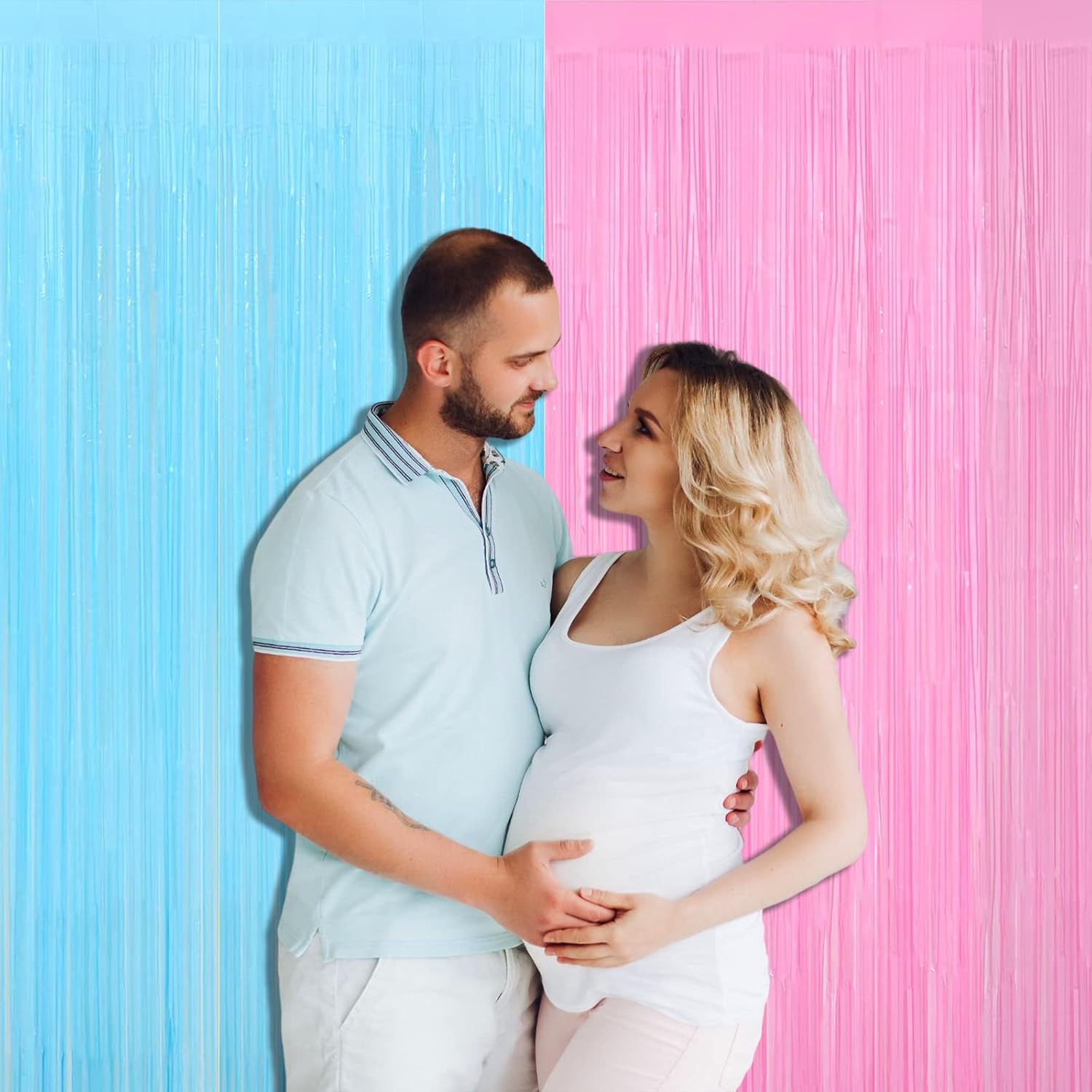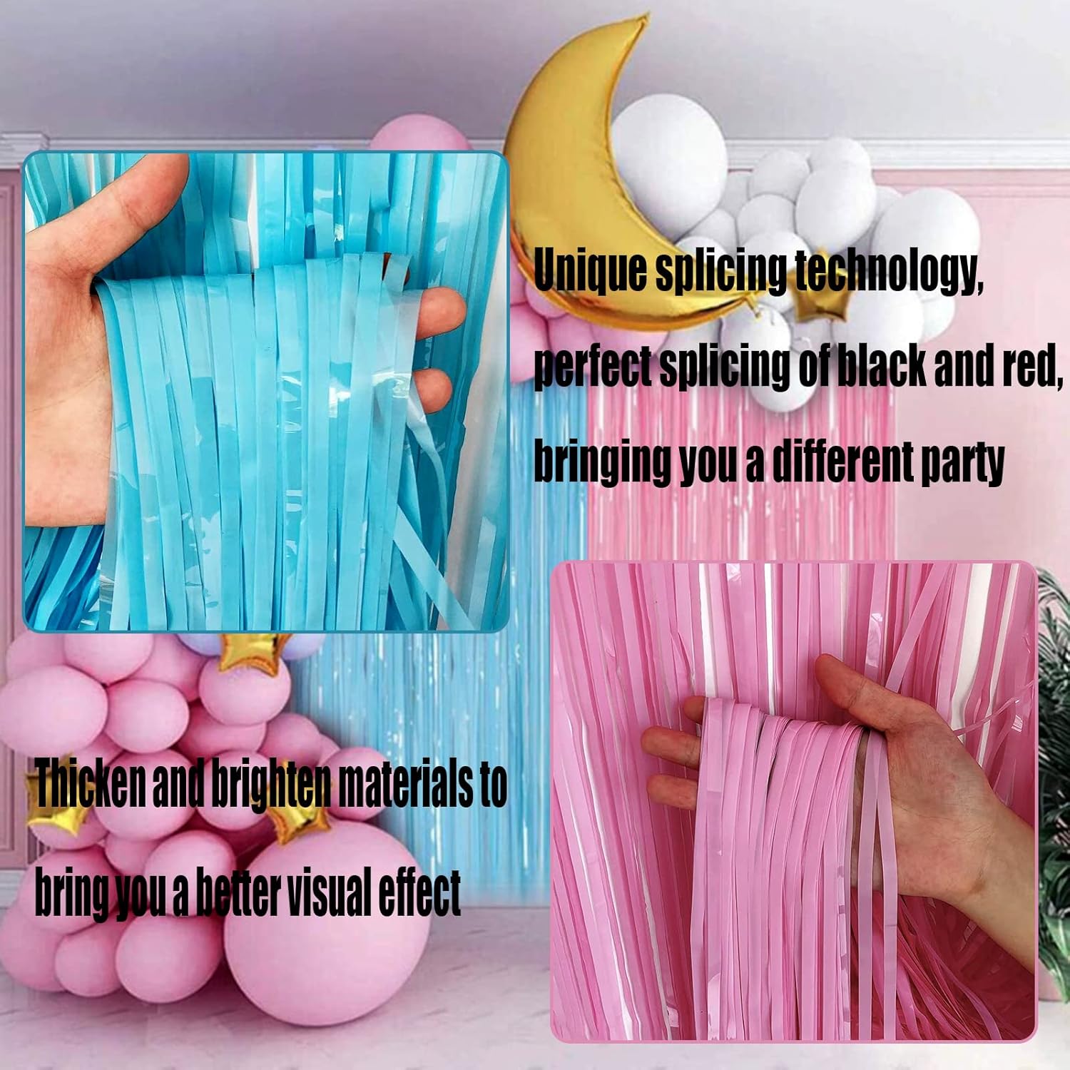 4 Pack Macaron Pink Blue Foil Fringe Curtain Backdrop, 3.28Ft x 8.2Ft Metallic Tinsel Foil Fringe Streamers for Photo Booth, Wedding Gender Reveal Backdrop Boy or Girl Birthday Party Decoration
