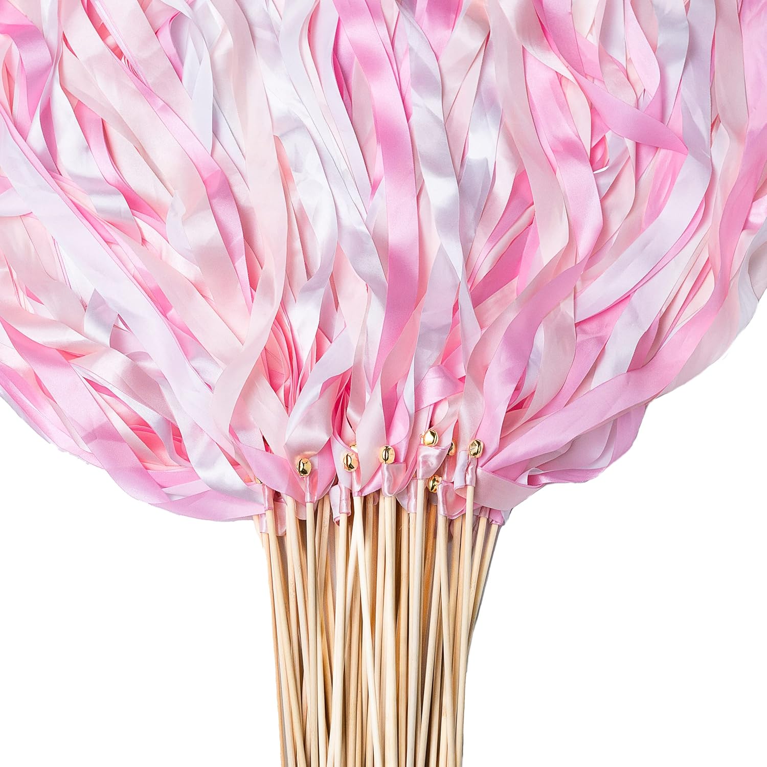 60 Pieces Wedding Colorful Ribbon with Bells, Party Ribbons Streamers Sticks Magic Wish Fairy Wand for Wedding Party Holiday Activities Favors (Pink-60)