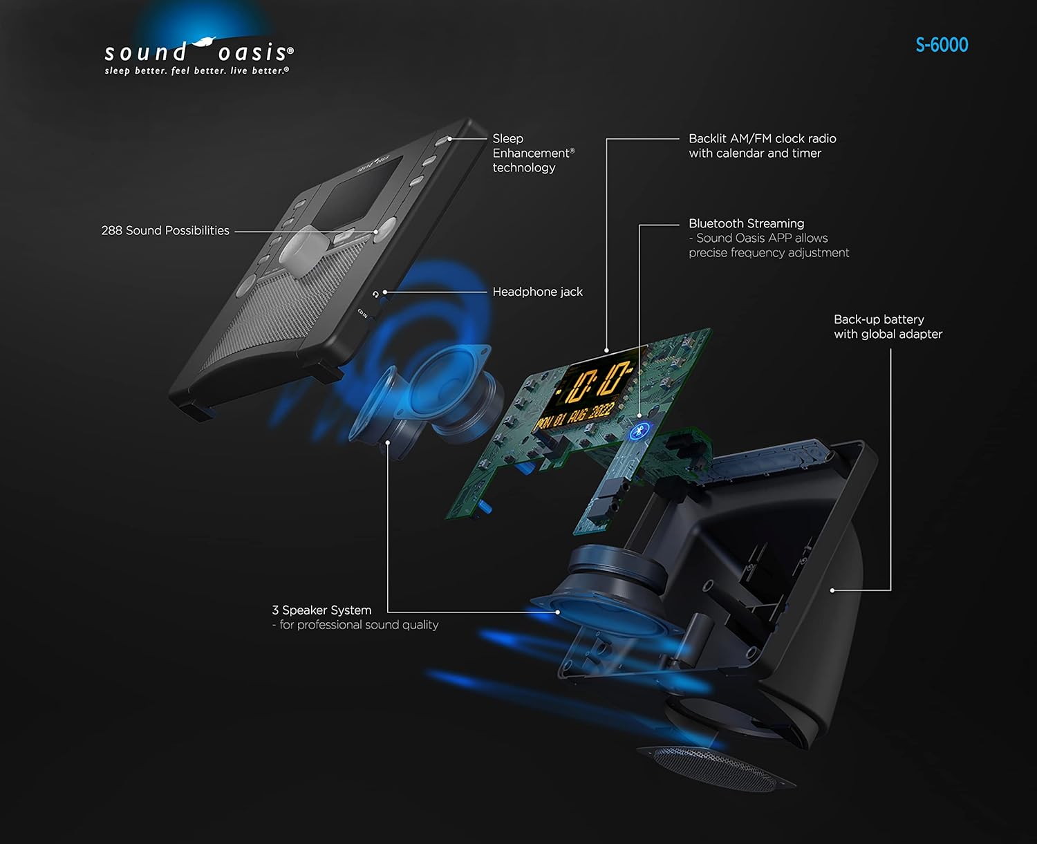 Sound Oasis Deluxe Bluetooth Sleep Tinnitus Sound Machine, World’s Best White Noise Machine for Better Sleep, Tinnitus Management, Clock Radio 288 Sounds