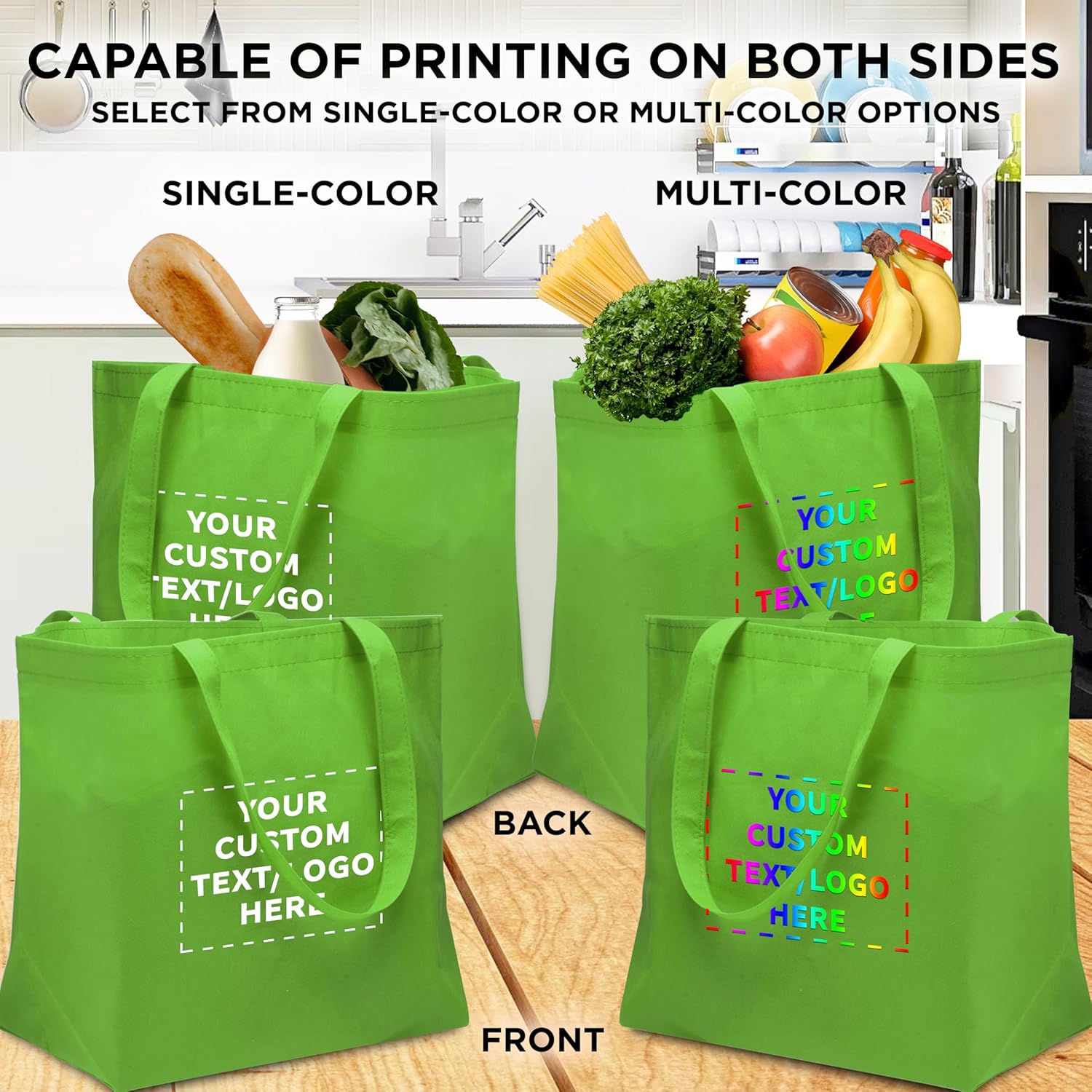 DISCOUNT PROMOS Custom Southern Style Grocery Tote Bags Set of 100 - Personalized Bulk Pack, Reusable Grocery & Shopping Bags - For Travel, Business Promotions - Lime Green - 20"X13"X8"