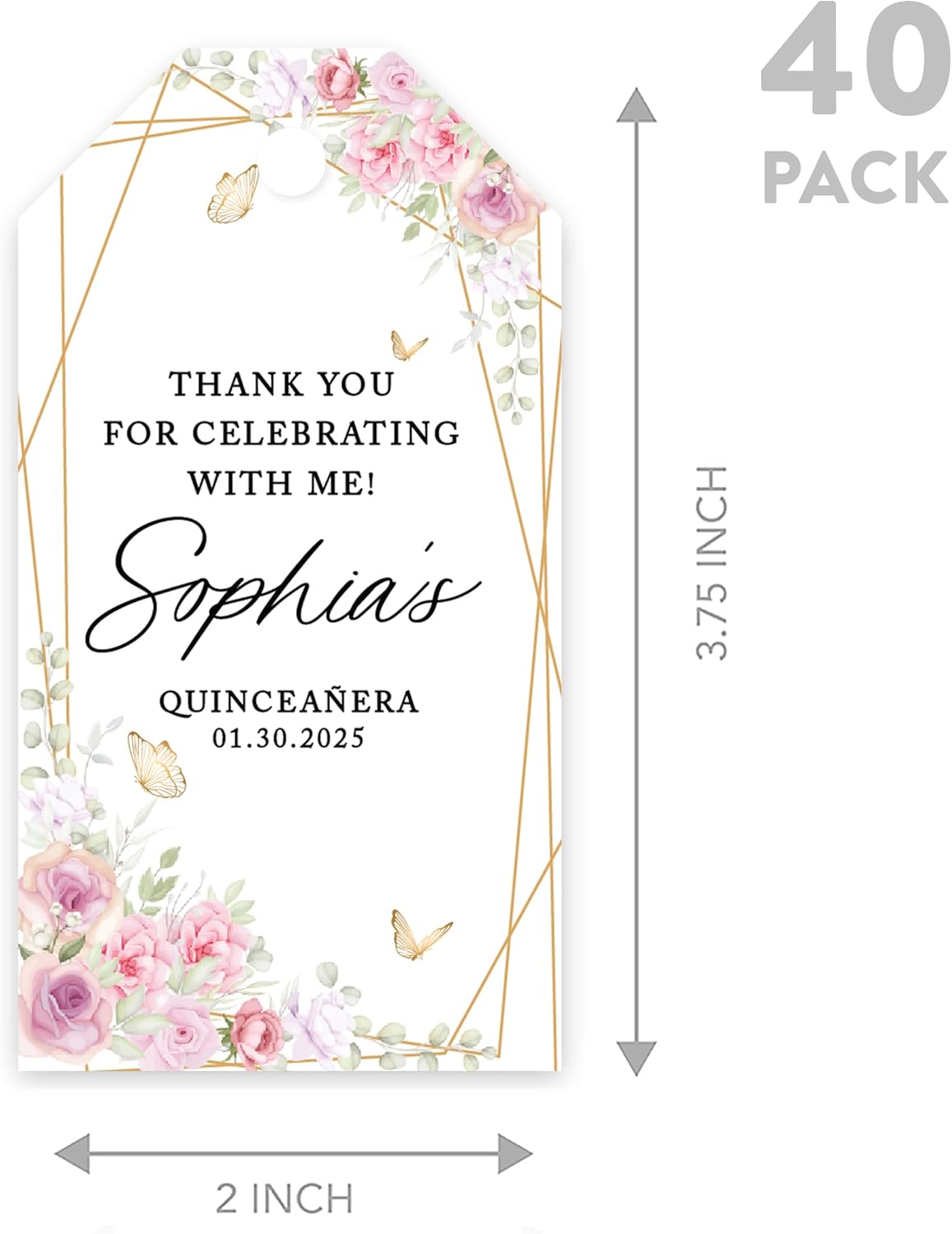 Andaz Press 40-Pack Personalized Quinceañera Favor Tags with String, Butterflies & Florals Custom Classic Thank You Gift Tags for Mis Quince Años XV 15th Birthday Favor Gifts, Decorations