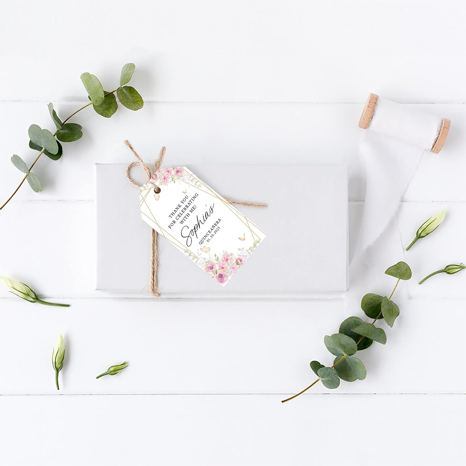 - THE PERFECT SIZE: Each single-sided thank you for celebrating with me tag is 2 X 3.75 inches with pre-cut holes. Baker's twine included. It is the perfect size to add to quinceañera favors. Sold as a bulk of 40 tags, personalize your gifts with a small thank you tag for your quince party favors and quinceañera decorations. Give your family, friends, and guests a moment to remember for a long time.