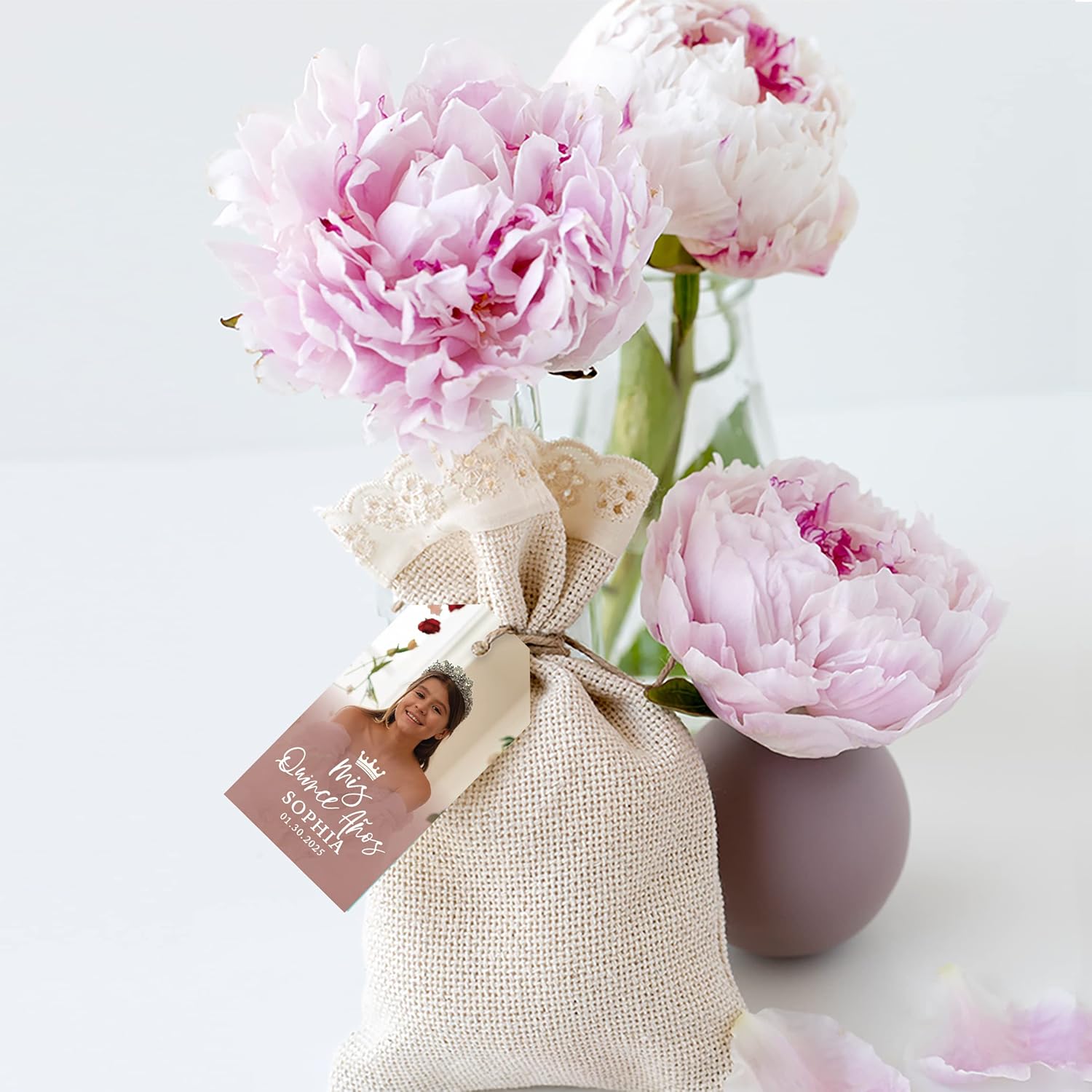 - HIGH-QUALITY: The pack of 40 custom photo tags for your quinceañera favors is digitally printed on high-quality 300 GSM cardstock paper, the single-sided tags are lightweight but durable—scratch-proof, smudge-proof, and long-lasting. The pre-punched hole makes it easy to string and attach to gifts. These tags come with twine to hang on a variety of quince favor gifts, thank-you gifts, welcome bags, favor bags, and favor boxes.