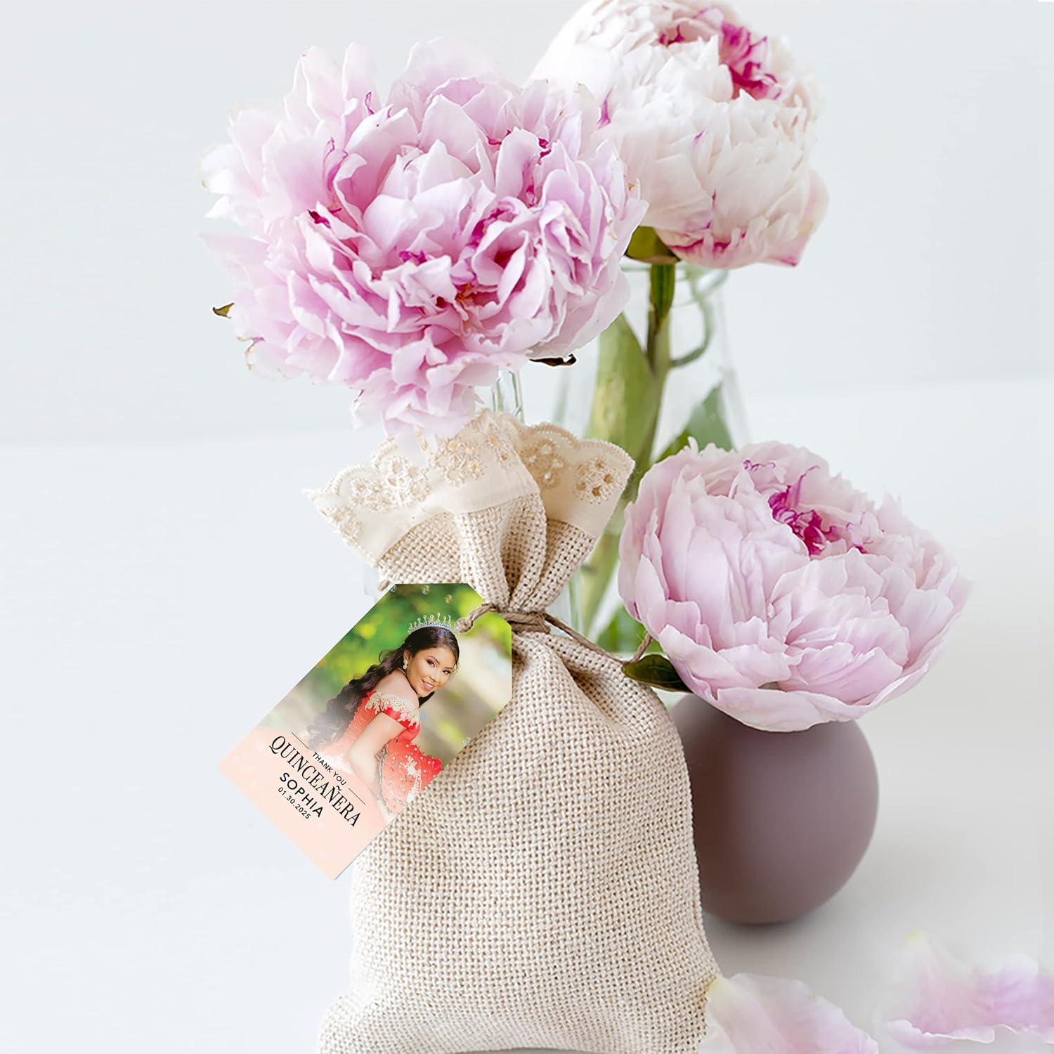 - HIGH-QUALITY: The pack of 40 custom photo tags for your quinceañera favors is digitally printed on high-quality 300 GSM cardstock paper, the single-sided tags are lightweight but durable—scratch-proof, smudge-proof, and long-lasting. The pre-punched hole makes it easy to string and attach to gifts. These tags come with twine to hang on a variety of quince favor gifts, thank-you gifts, welcome bags, favor bags, and favor boxes.