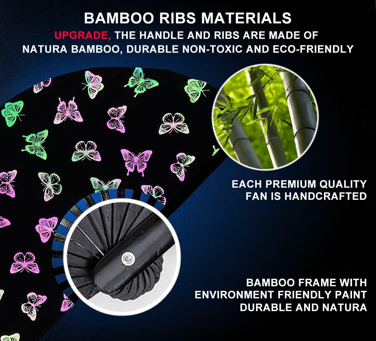 - Durable and lightweight: Not only is this fan eye-catching, but it's also practical and fun. With a larger size than most hand fans, it's great for creating an even bigger impact at raves, music festivals, and other events. Made with a sturdy bamboo frame, this fan is durable and lightweight, making it easy to carry with you wherever you go.