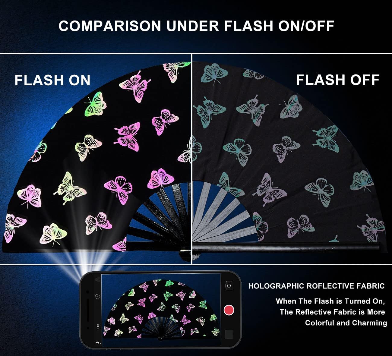 - Eye-catching design: Introducing the ultimate party accessory - the Large Hand Fan! This fan is perfect for anyone who loves to stand out and make a statement. Featuring a reflective holographic rainbow design, this fan is sure to catch the eye and turn heads wherever you take it.