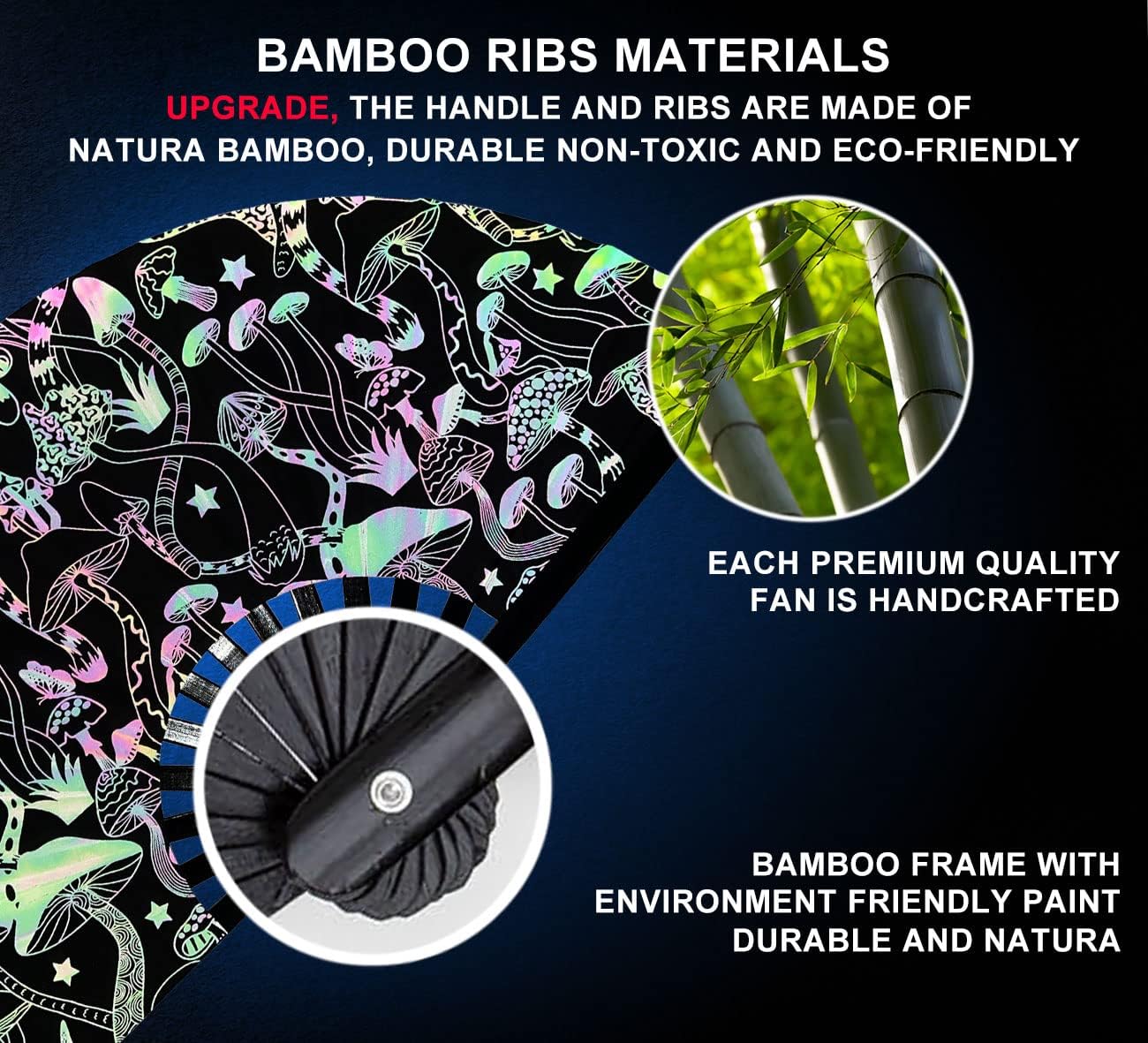 - Durable and lightweight: Not only is this fan eye-catching, but it's also practical and fun. With a larger size than most hand fans, it's great for creating an even bigger impact at raves, music festivals, and other events. Made with a sturdy bamboo frame, this fan is durable and lightweight, making it easy to carry with you wherever you go.