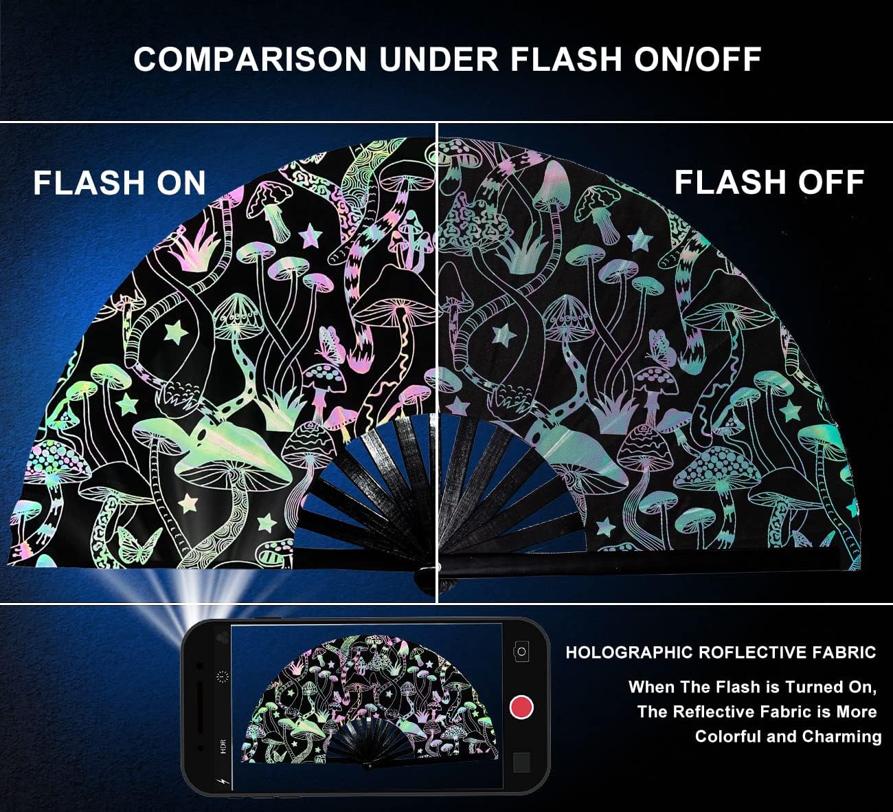 - Eye-catching design: Introducing the ultimate party accessory - the Large Hand Fan! This fan is perfect for anyone who loves to stand out and make a statement. Featuring a reflective holographic rainbow design, this fan is sure to catch the eye and turn heads wherever you take it.