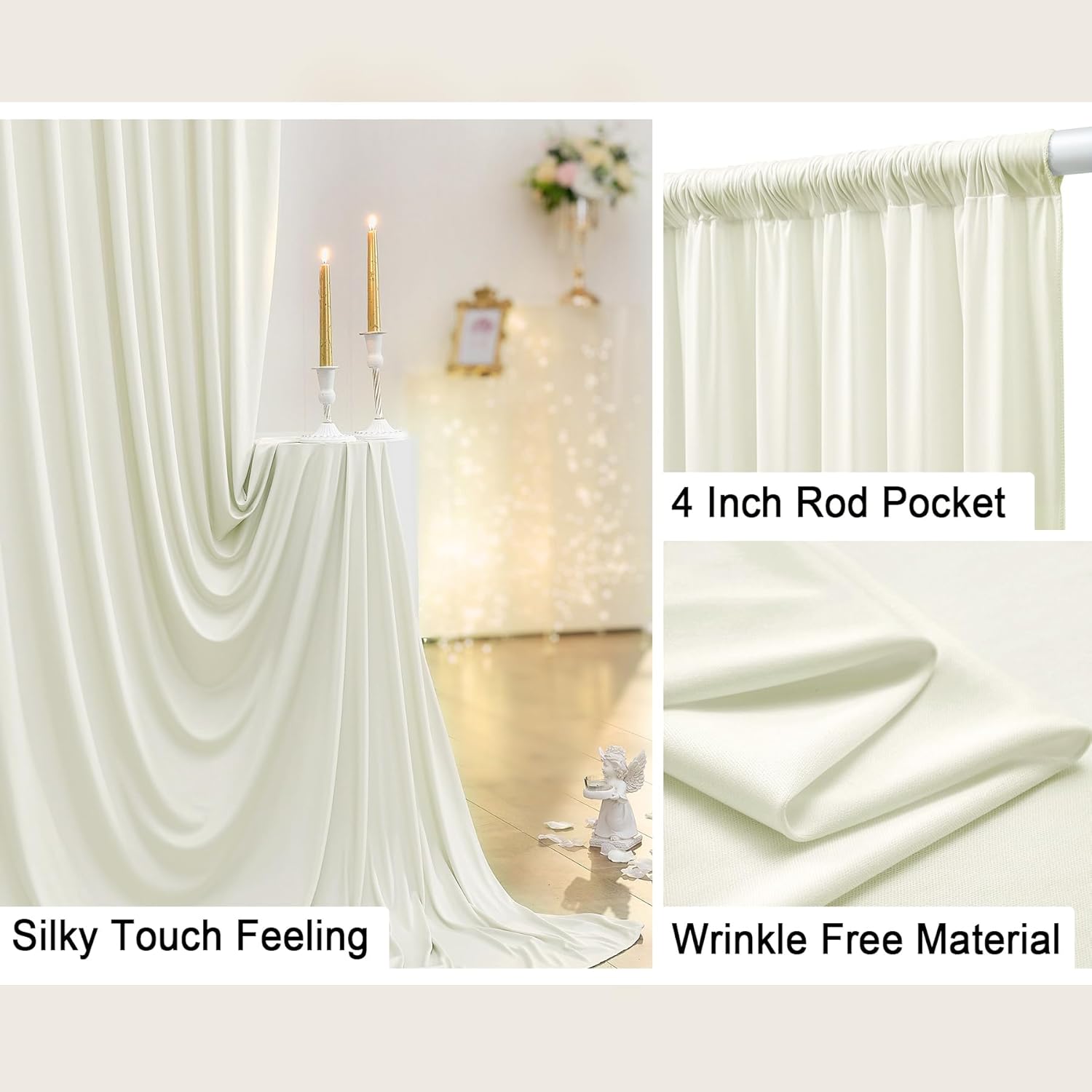 - Large Ivory Photo Backdrop is Suitable Various Occassions: Our polyester drapes are perfect for kinds of accassions. Such as theme parties, wedding, baby shower, birthday party, photography, bridal shower, gender reveal, princess party, engagement party, baptism, candy buffets, dessert table, sweet table, background, photo booths, photoshoot, ceremony, anniversary, graduation, home decorations, holiday party, stage curtain and more.