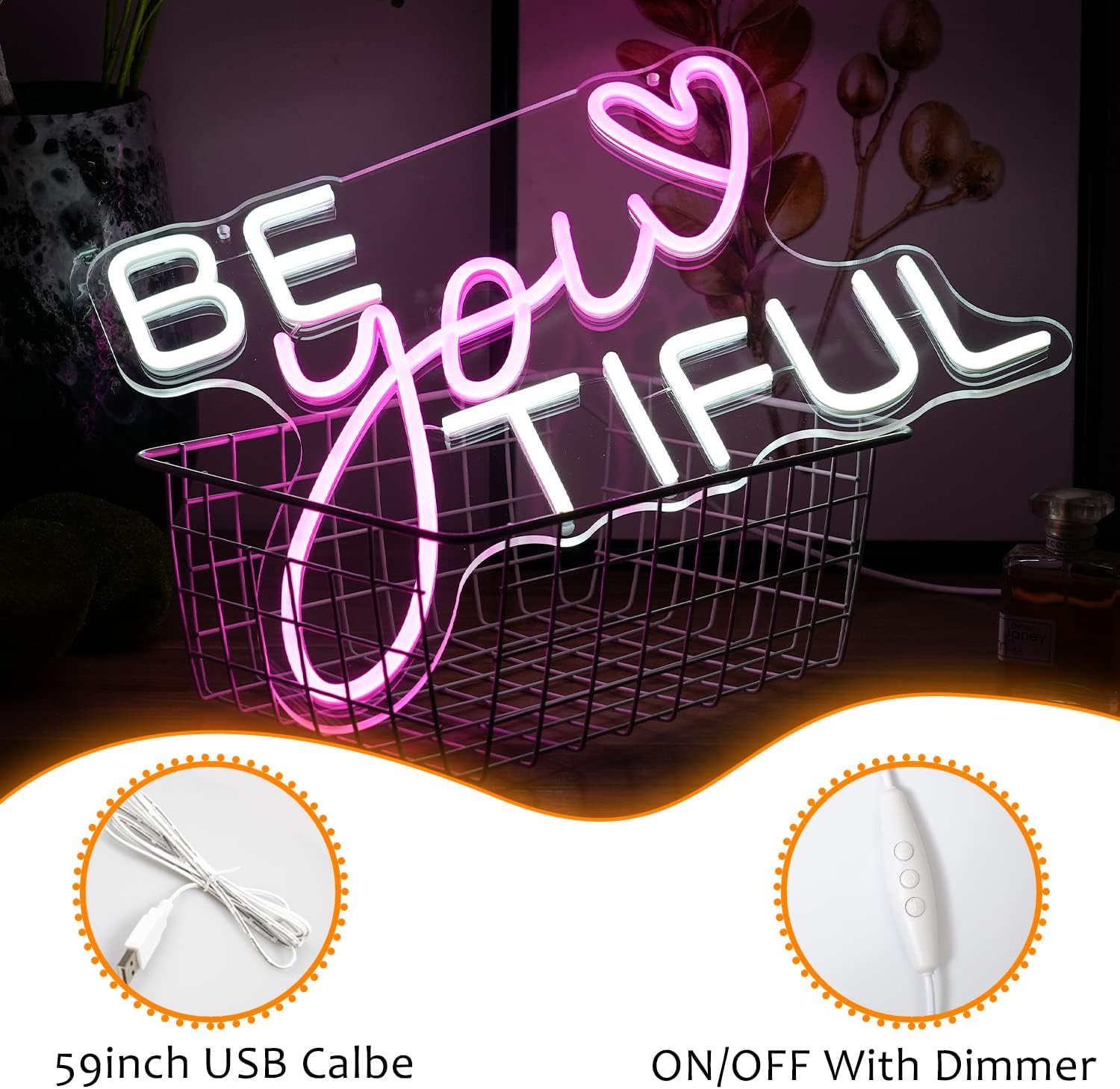 Be Your Tiful Neon Sign Dimmable Letter Neon Signs White Pink Wall Decorative Lights Powered USB with Switch for Bedroom Kid Room Shop Apartment Birthday Party Wedding (15.7’’X11.8’’)