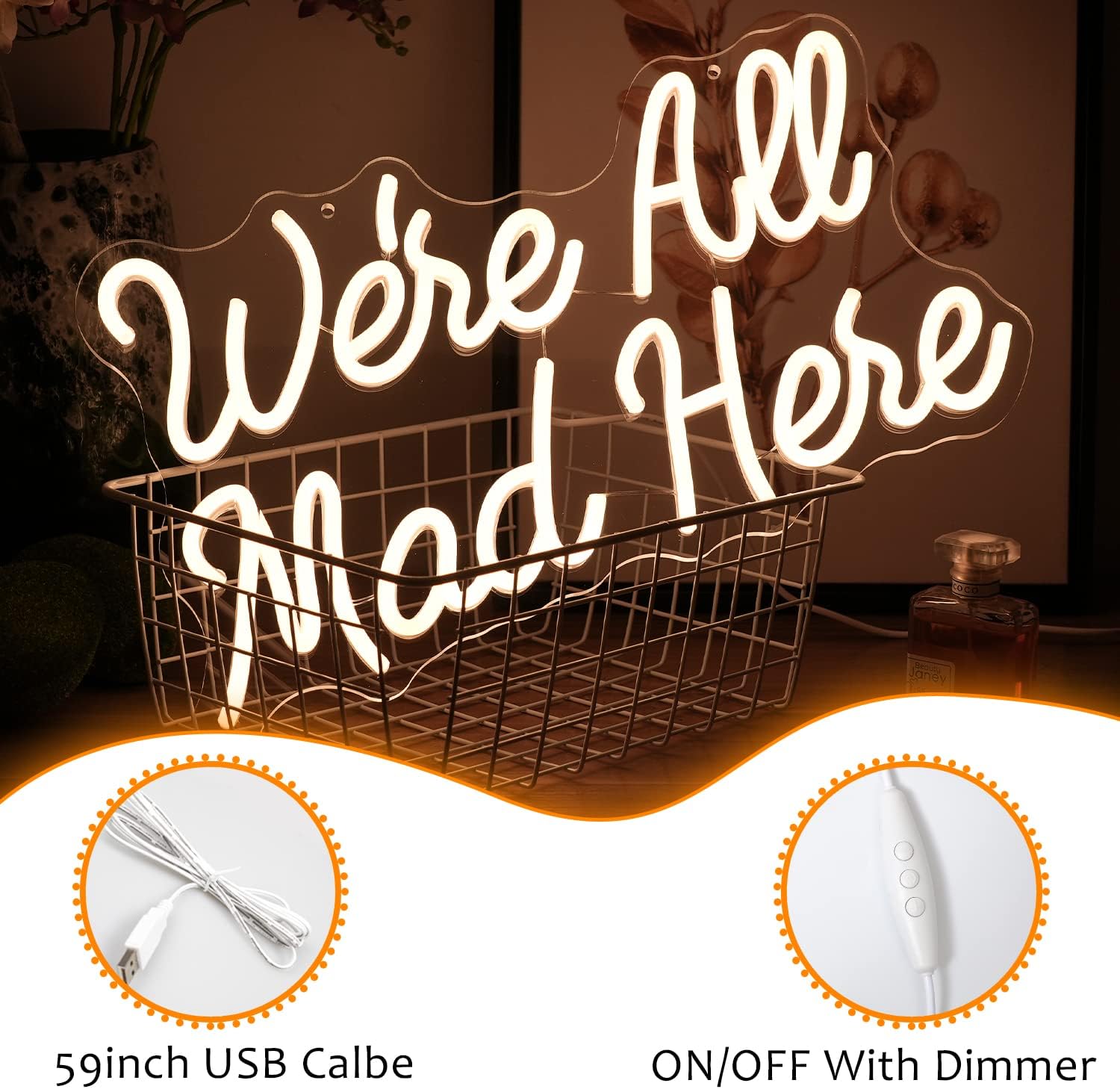 - Easy to use: We Are All Mad Here neon wall light is comes with 59in USB power cable and an on/off switch. neon signs have two holes at the back(iron chain, hook and screw include)