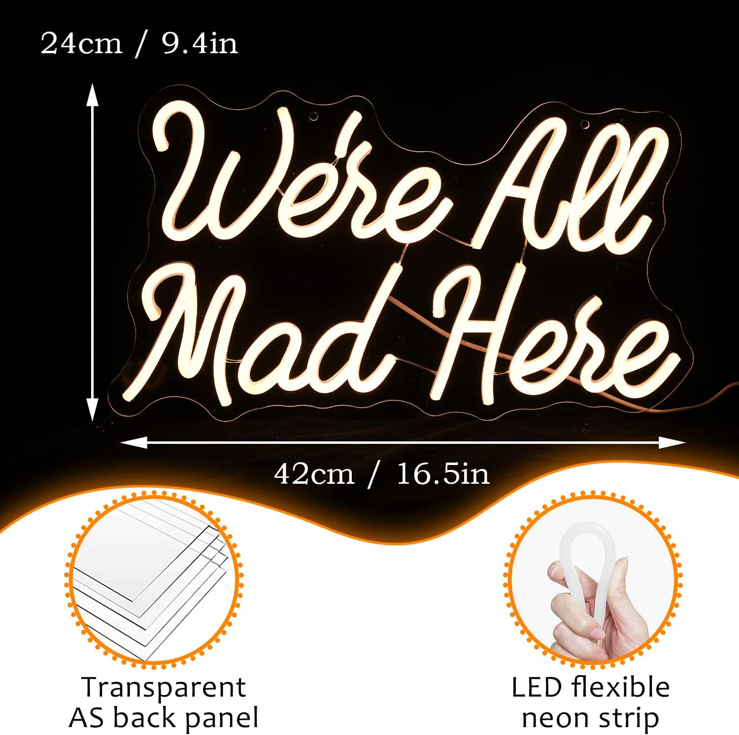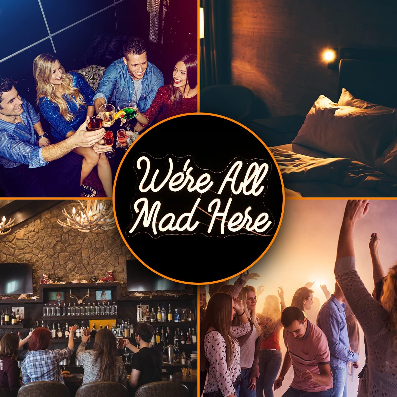 - Various uses: We Are All Mad Here wall neon signs are an ideal highlight for home décor and parties. the decor of We Are All Mad Here is perfect for decorating game rooms, radio studios, living rooms, offices, bars, parties, shops, bookshelves and balconies. Make simple life more colorful and fun.