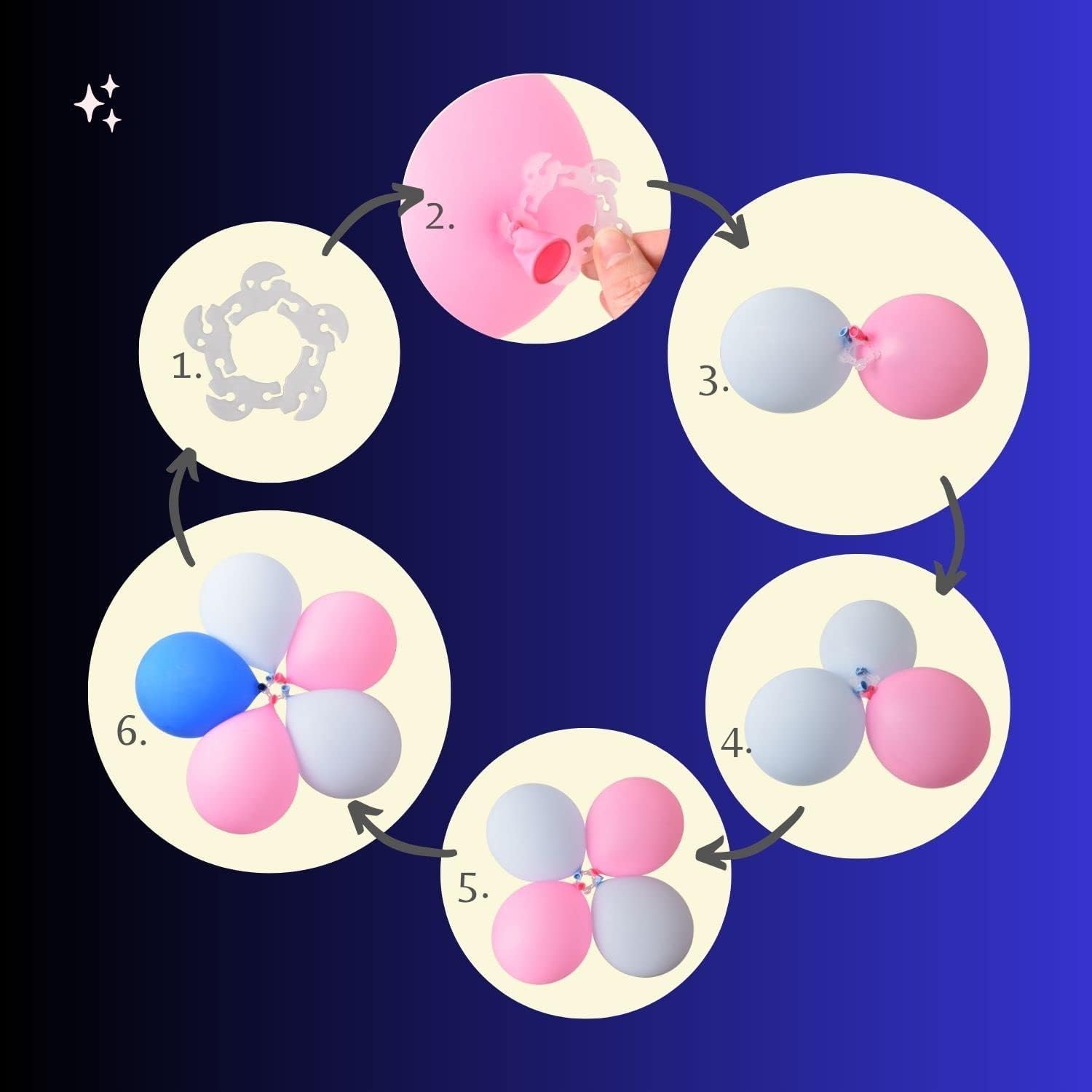 - ăEasy to Assemble Balloon Arch Ring BucklesăEach balloon accessories clips can fix 5 balloons, you just inflate your balloons and tie, then install the balloon over the clips and adjust the shape