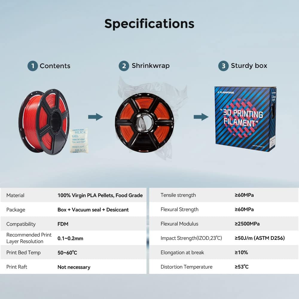 - 【High Printing Performance】FLASHFORGE 3D printer filament 1.75mm PLA is designed to meet the needs of highly detailed printing and ensure a consistent color, dimensional accuracy, and no warping, no jamming, or layer delamination issues. It provides the best printing experience for 3D printing enthusiasts.