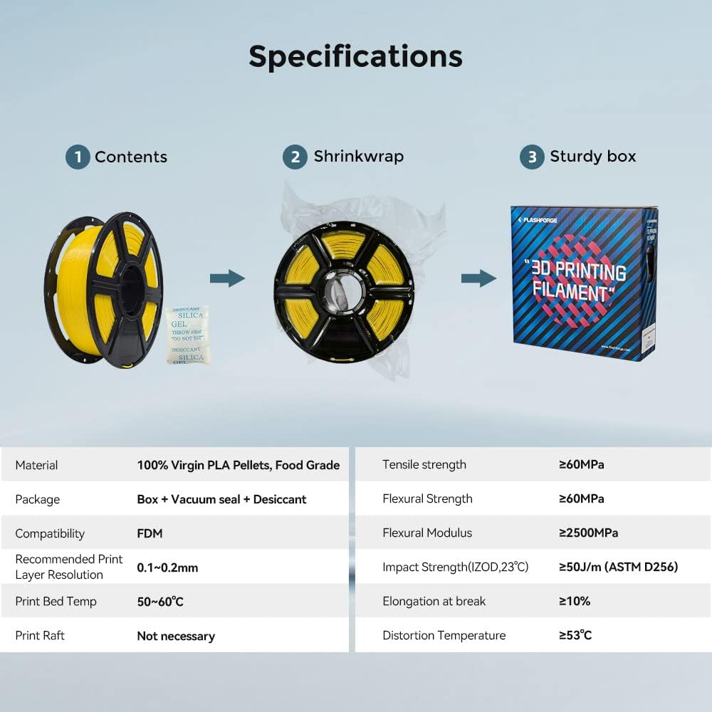 - 【High Printing Performance】FLASHFORGE 3D printer filament 1.75mm PLA is designed to meet the needs of highly detailed printing and ensure a consistent color, dimensional accuracy, and no warping, no jamming, or layer delamination issues. It provides the best printing experience for 3D printing enthusiasts.