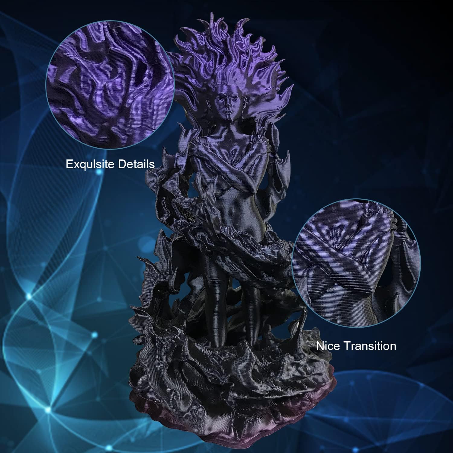 - 【PLA Filament Silk Shiny】- High quality Silk PLA Filament with Silk Black & Shiny Purple colors changing. PLA Filament normally around 15-18 meters change color and is excellent for the larger prints to show all colors. The PLA filament is color change dual colors - black, purple, and a little blue as a transition color. You would get a complete discoloration when you print a 120g object.