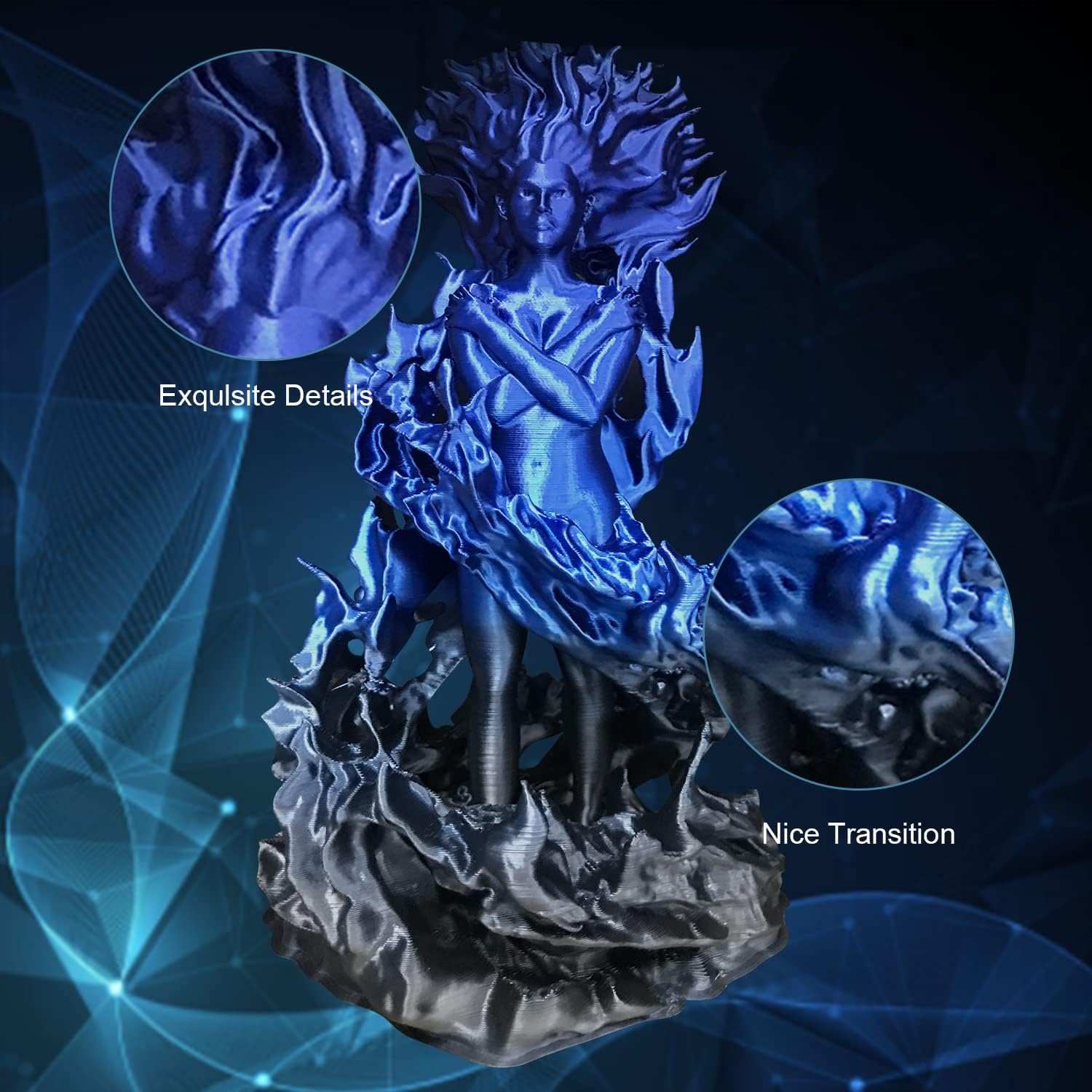 - 【PLA Filament Silk Shiny】- High quality Silk PLA Filament with Silk Black & Shiny Blue colors changing. PLA Filament normally around 15-18 meters change color and is excellent for the larger prints to show all colors. The PLA filament is color change dual colors - black, Blue, and a little purple as a transition color. You would get a complete discoloration when you print a 120g object.