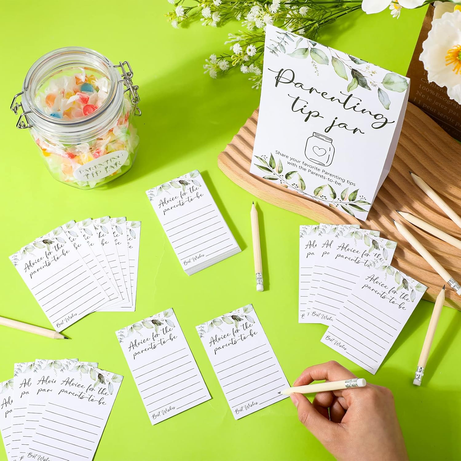 Roowest Baby Shower to Baby Advice Cards for New Parents to Be - Tip Jar Sign for New Parents 60 Parenting Advice Cards 10 HB Pencils 2 Cute Stickers 1 Pet Bottle for Guests Games(Leaf)