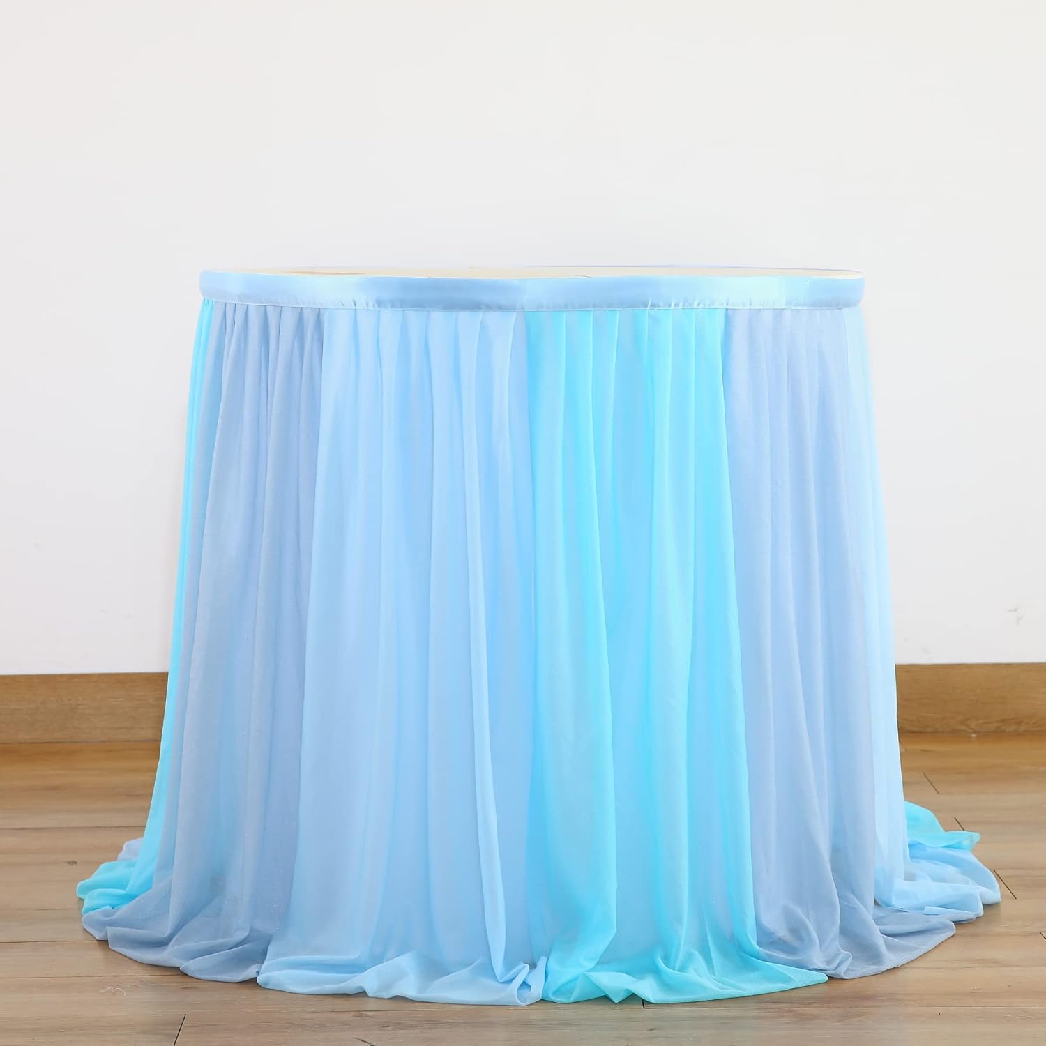 - Easy install: The blue tutu table skirts sewn with loop under the top edge, and the package include hook with back adhesive. Stick the hook on the table and put the table skirt top edge right on the hook, the hook and loop stick together, done!