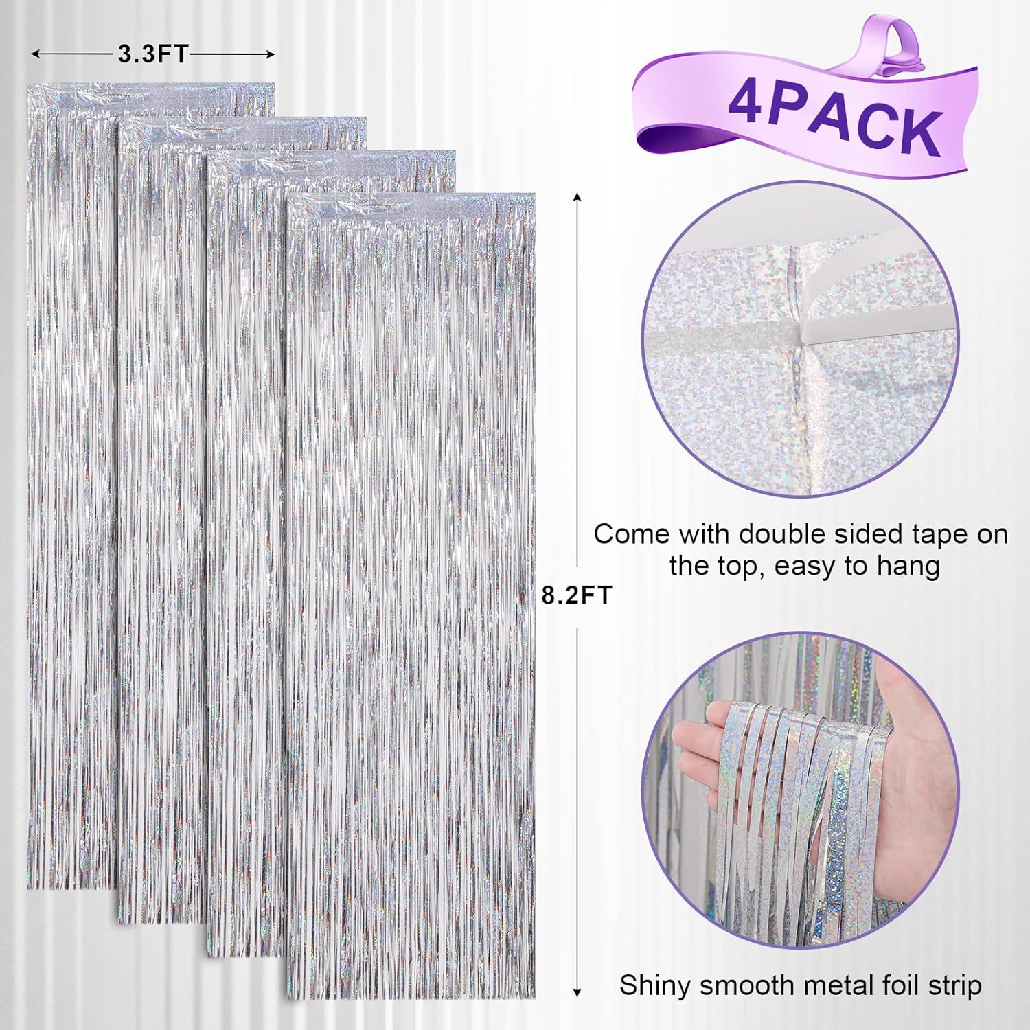 - Package Included: 4 packs of foil fringe curtains, the size of the foil curtain is 3.3*8.2 ft. It's long enough to fit any occasion. Please do not stick the foil curtain on uneven or stained walls to prevent it from falling off