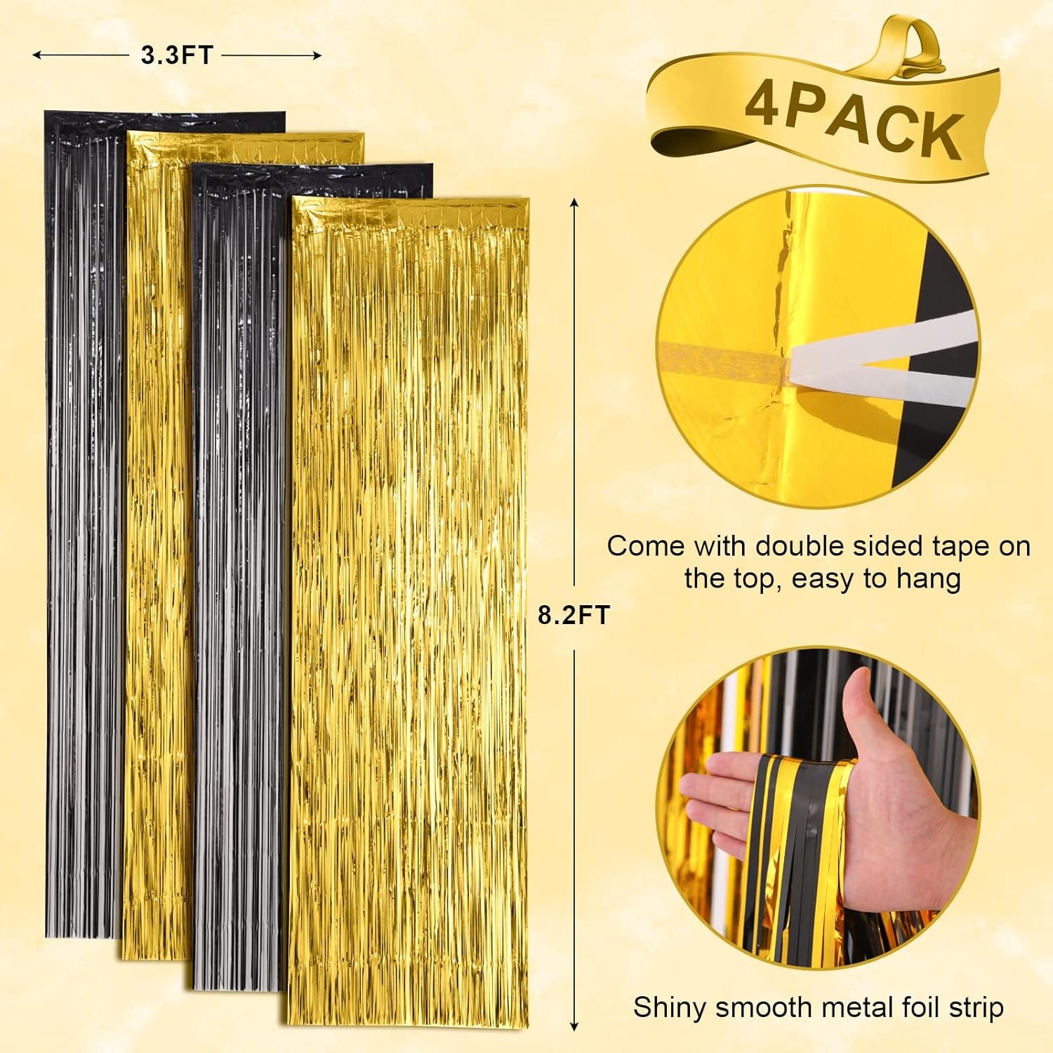 - Package Included: 4 packs of foil fringe curtains, the size of the foil curtain is 3.3*8.2 ft. It's long enough to fit any occasion. Please do not stick the foil curtain on uneven or stained walls to prevent it from falling off