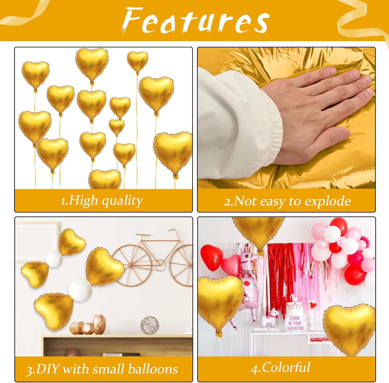 - π 10 PCS GOLD FOIL HEART BALLOONS: Package contains 10 x 18 inch gold heart balloons, 1 x 10m ribbon.The gold heart shape balloons are specially shaped, the perfect size for your holiday or party decorating needs, together create a fun and surprising party, leave an unforgettable smile!