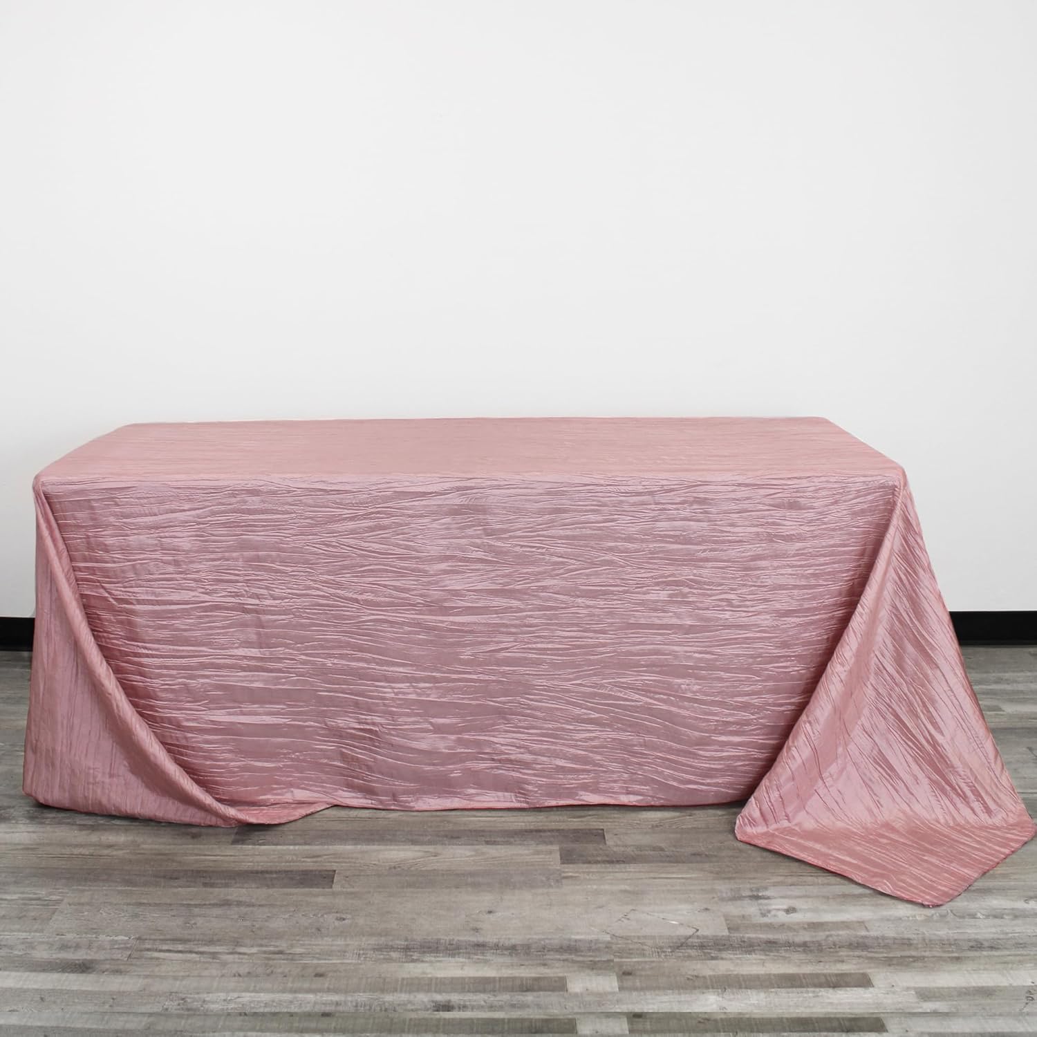 - Transform your wedding or event with our 90 x 156 inch crinkle taffeta tablecloth. Its elegant dusty rose color adds a touch of sophistication to any occasion.