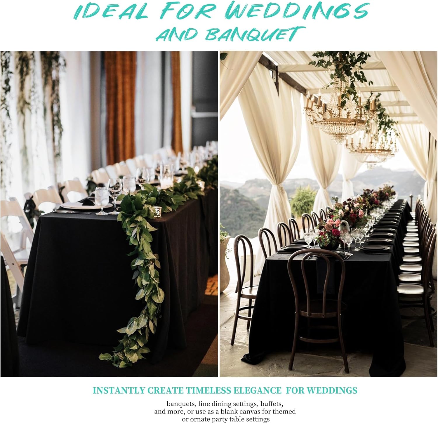 - đ„ăDecorative Table CoversăPolyester is an efficient and economical choice for a tablecloth, it's extremely versatile and can be dressed up for an ultimate glam event, dressed down for a rustic vintage both wedding, and can even be used as a clean and modern look for a minimalist event. Classic colors to meet your different subject of events, like weddings, banquets, birthday or dinner party, bridal or baby shower, candy buffet,and other everyday functional or decorative use.