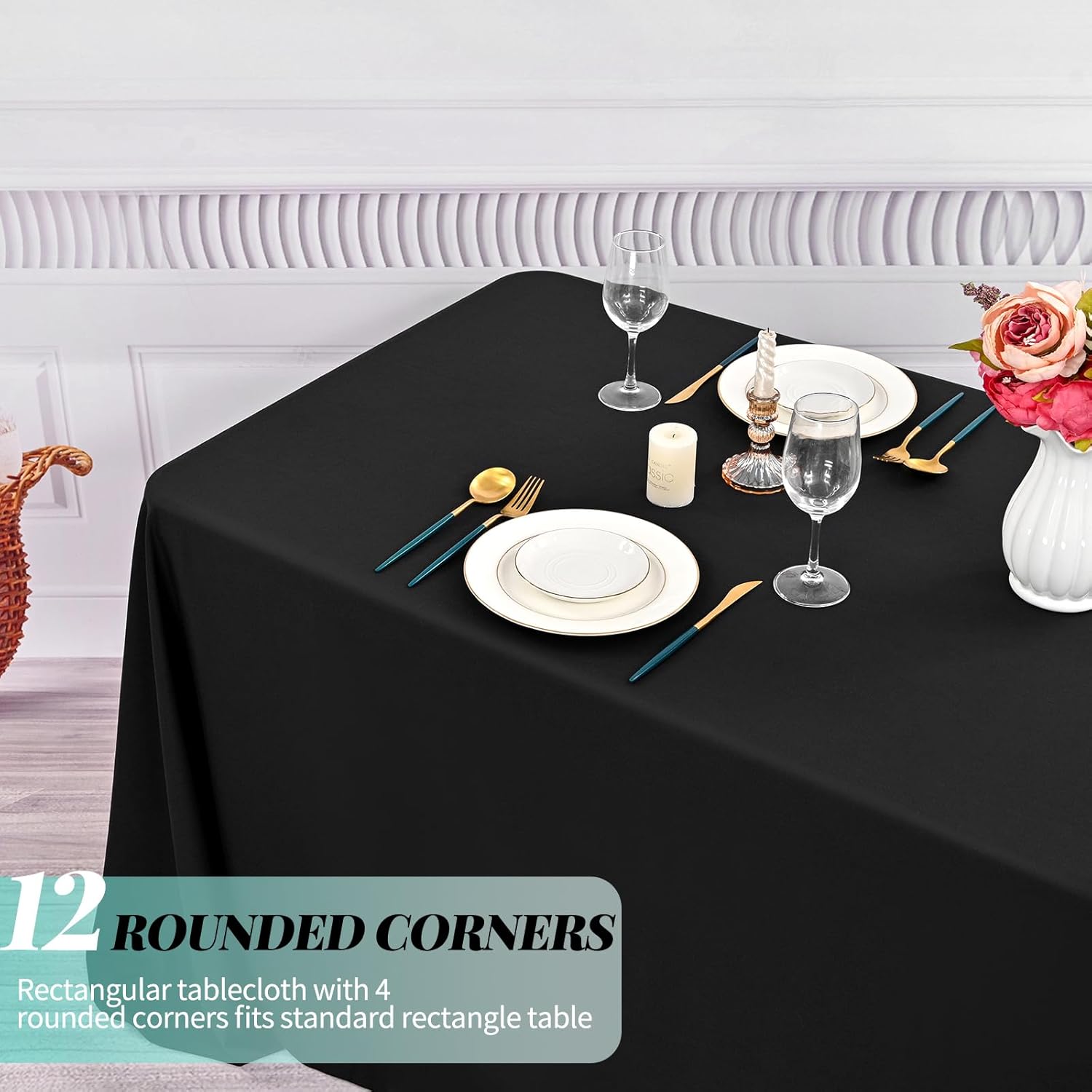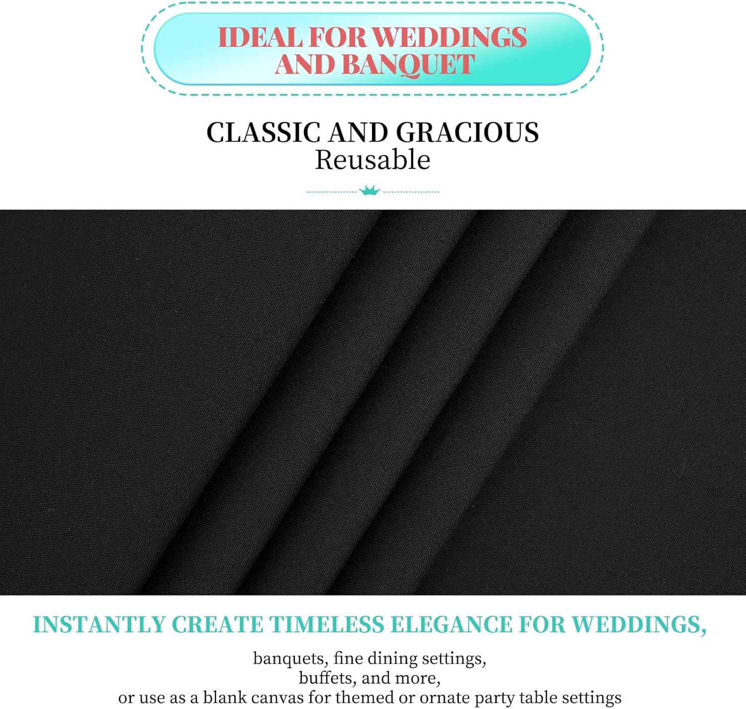 - đ„ăPremium Tablecloth FabricsăYou can get 12 pieces black tablecloth, our tablecloth is made of soft premium polyester fabric that resists wrinkling for an always crisp, polished look. These materials are as skin-friendly as they are environmentally friendly. Protect and decorate your tables.