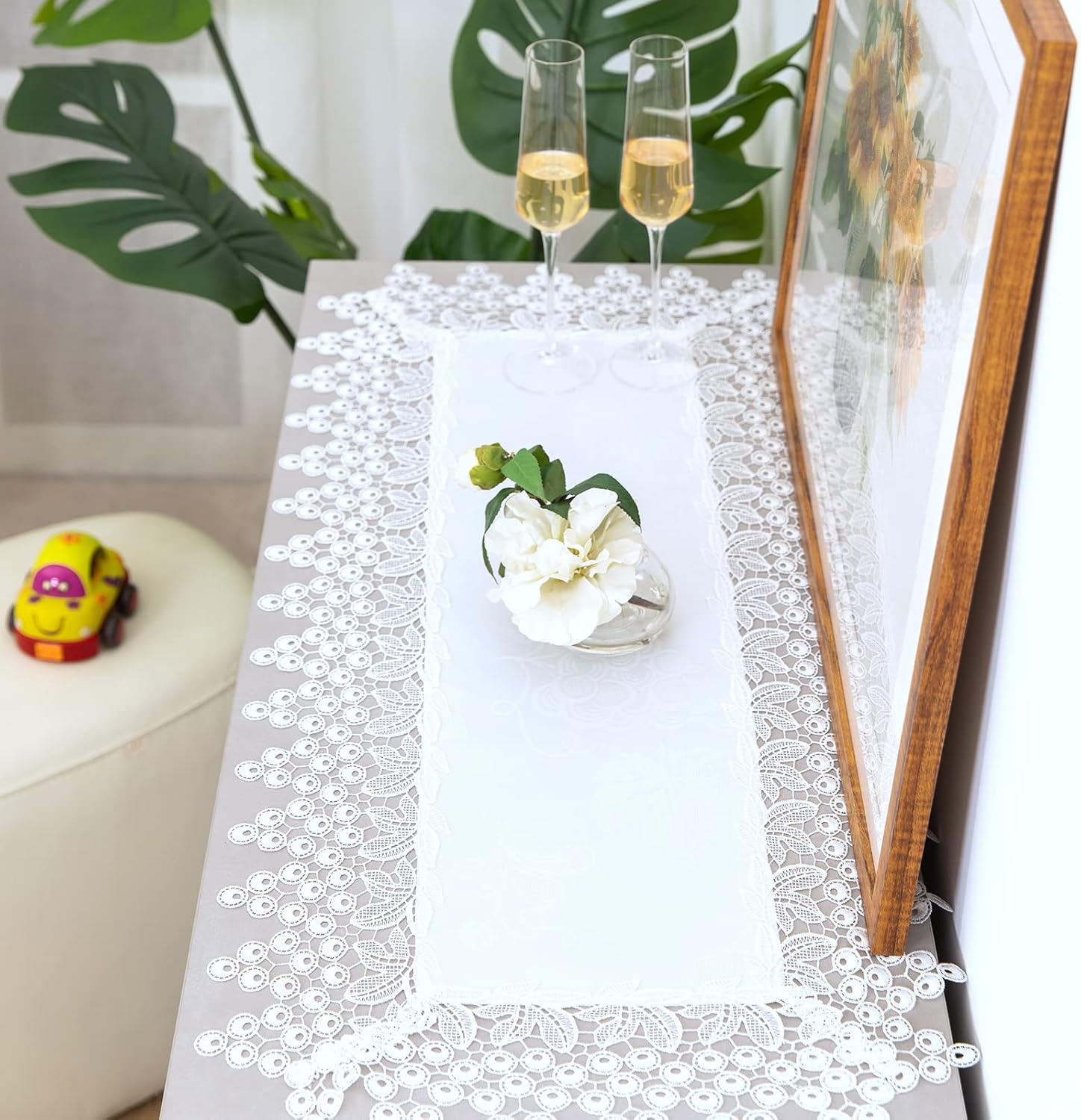 White lace Premium Rectangle Farmhouse Table Runner Waterproof OilProof SpillProof AntiShrink Soft Wrinkle Resistant Decorative Fabric Table Cover Kitchen Dinning Party Wedding Banquet