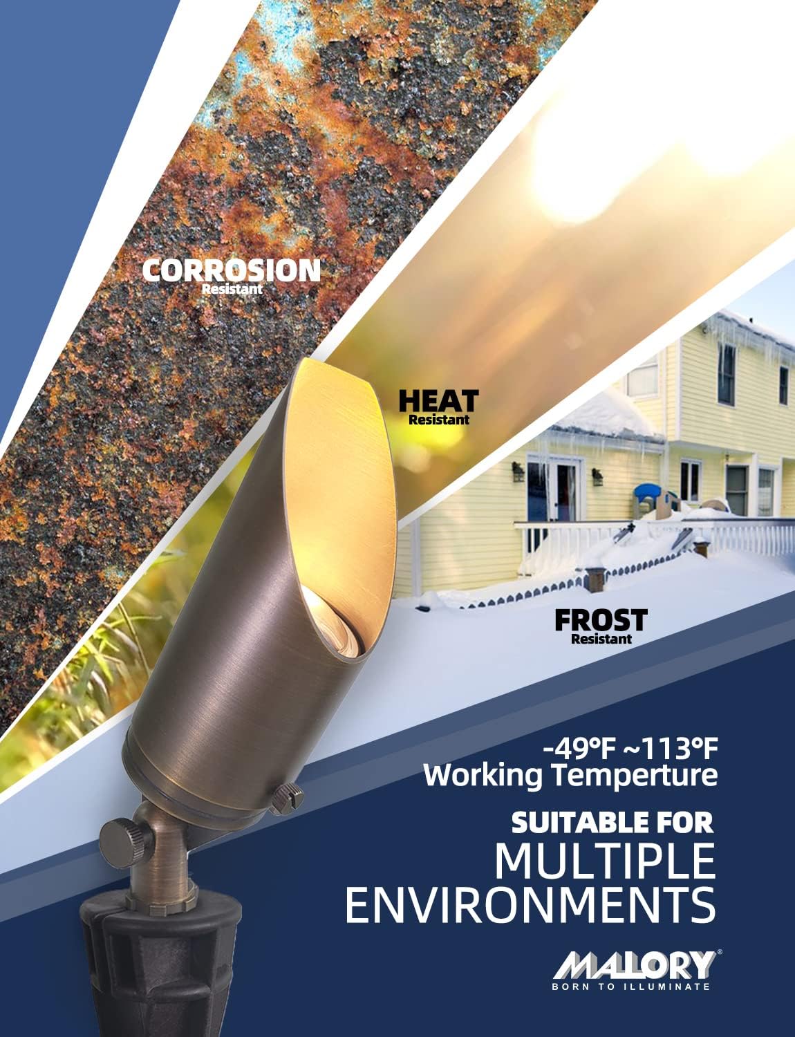 - BRASS LIGHT FIXTURE:MALORY landscape spotlight is constructed of die-cast brass for durability and beauty.Brass spot light doesn't corrode,more durable and reliable than aluminum and plastic fixtures,ideal for any uplighting application.Simple design structure for the light fixture make it looks beautiful yet unobtrusive in any landscape,suitable for decorating most houses and yards.