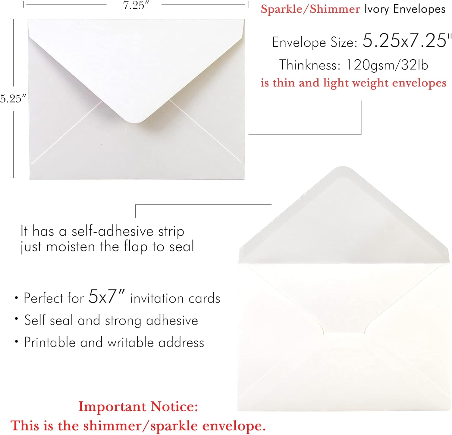PONATIA 50 PCS/Pack A7 Envelopes, 5.25 x 7.25'' Sparkle Ivory Envelope, Perfect 5x7 Envelopes for Wedding Invitation Cards, Christmas Gift Cards Envelope, Acrylic Invitations, Photos