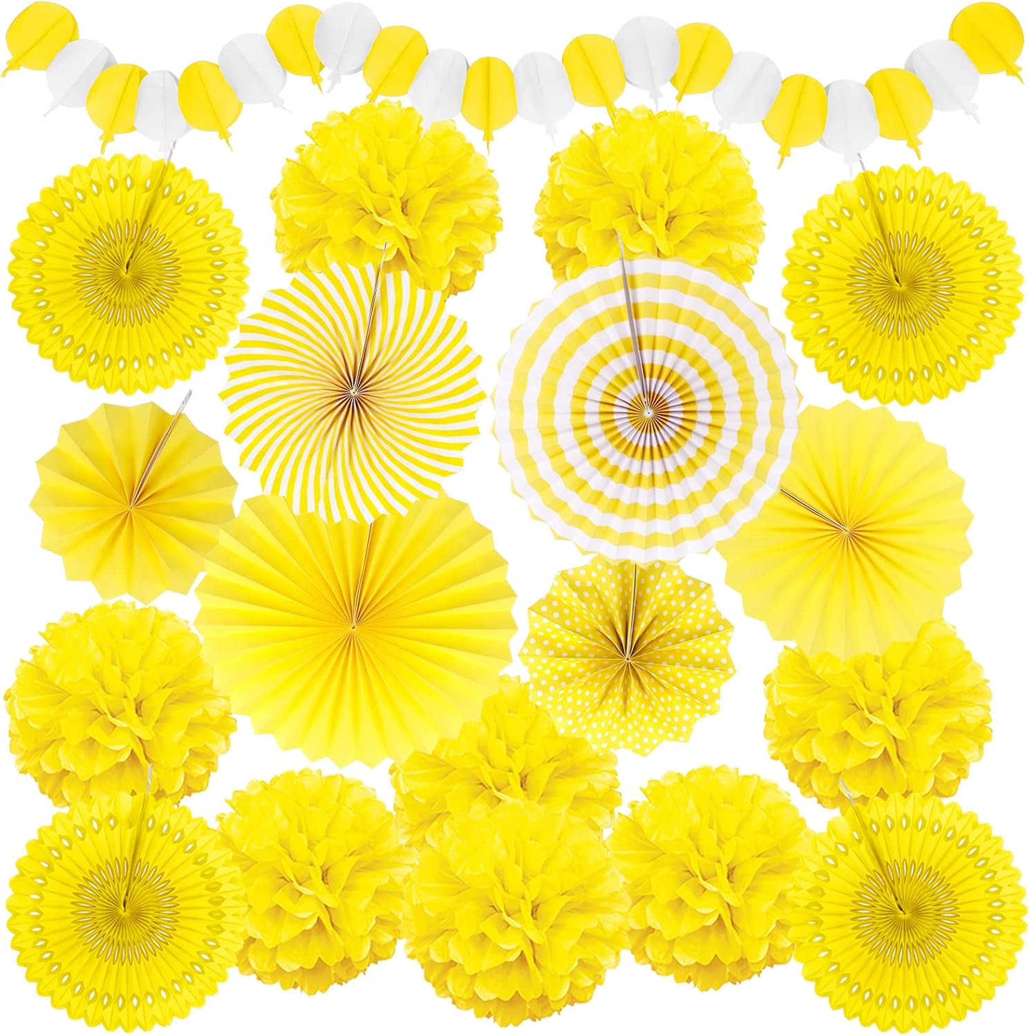 - 【What you will get】6 x paper fans, 8 x paper pompoms, 4 x paper hollow fans, 1 x paper hot air balloon garland (Color: Yellow)