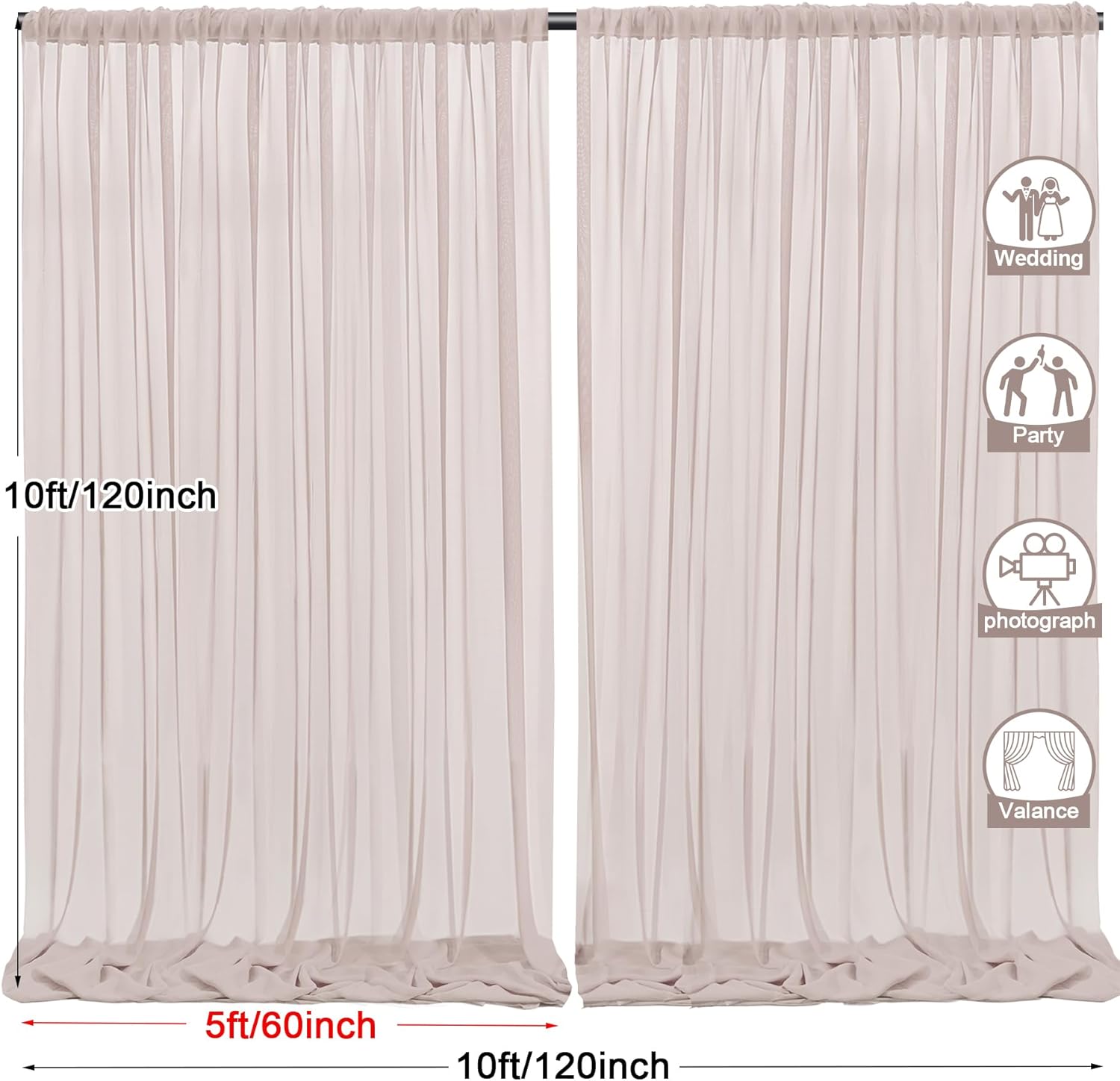 - 2 Panels Backdrop Drapes: Come with 2 panels Taupe chiffon backdrop curtains,each panels size is 5ft width and 10ft height. Combined, entire backdrop curtains is 10ft*10ft. Please note: Not including the background stand