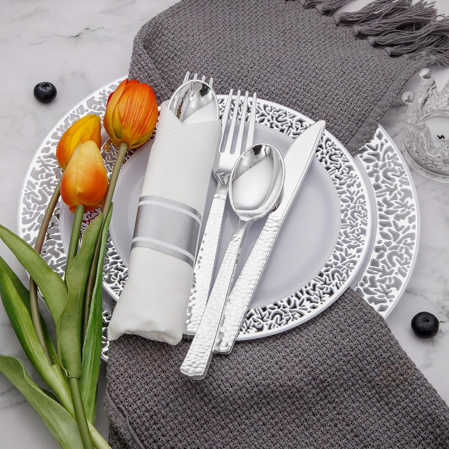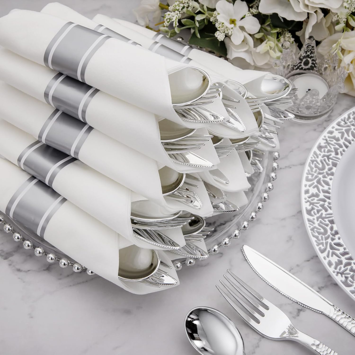 - Convenient Package: This pre-rolled silver plastic cutlery includes plastic cutlery with soft and absorbent napkins for up to 60 people, perfect for weddings, banquets, and holidays.The pre-rolled design saves setup time, making them perfect for larger gatherings.