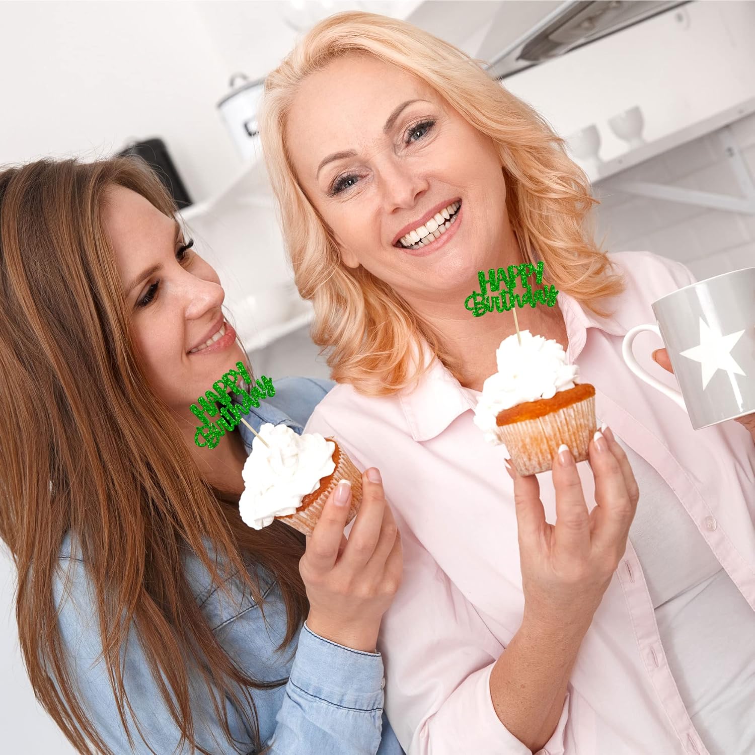 Gyufise 24 Pcs Happy Birthday Cupcake Toppers Glitter Cupcake Food Picks for Celebrating Theme Party Cake Decorations Supplies Green