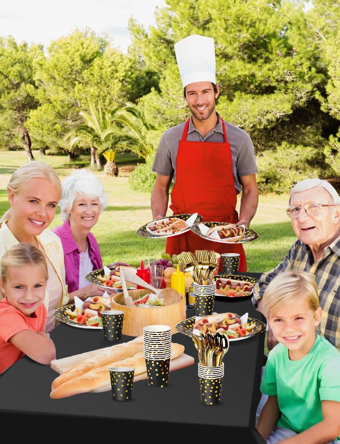 - Included Components : Paper Plates, Paper Cups, Napkins, Spoons, Forks, Knife, Tablecloth