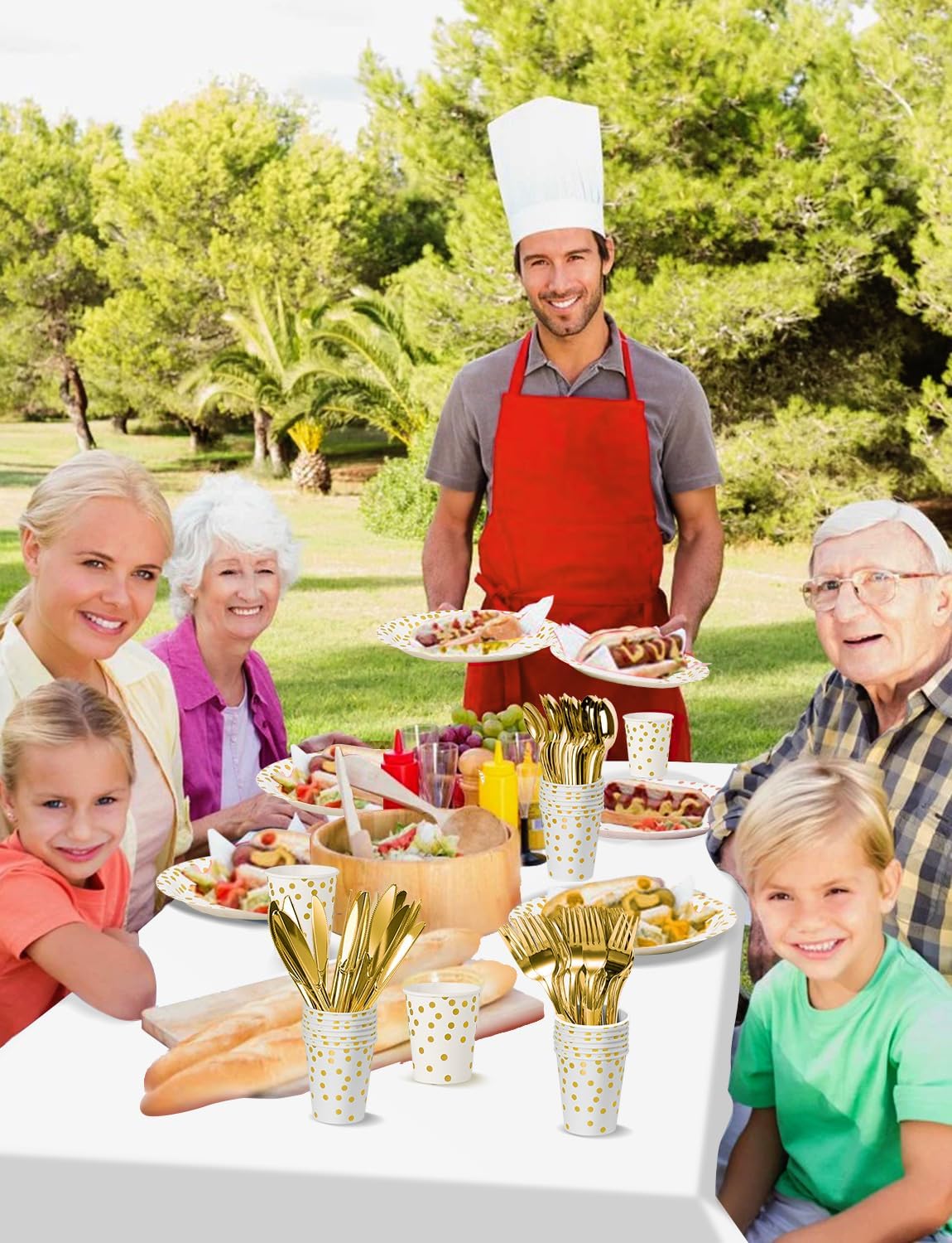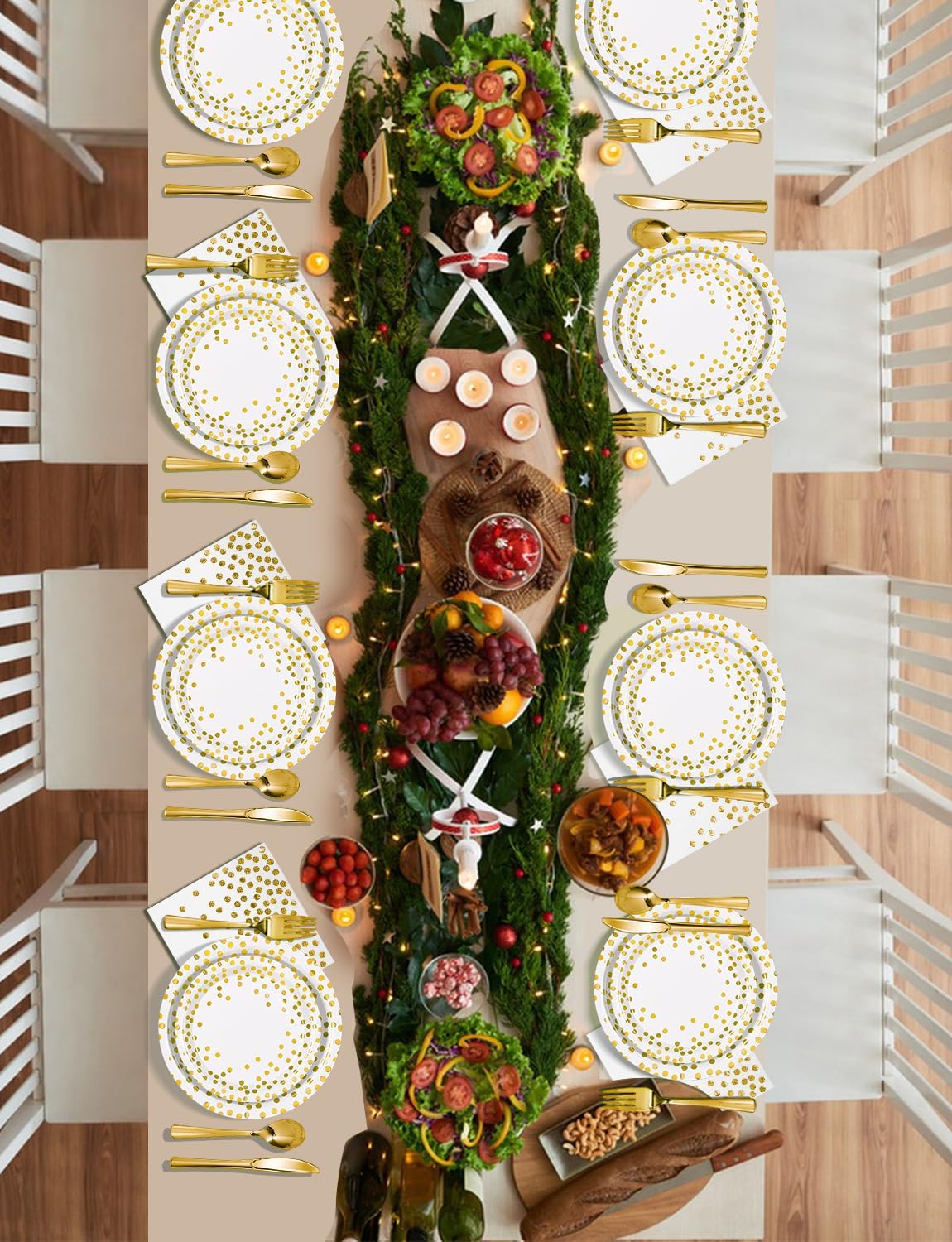 - 🍰【High Quality and Elegant Design】Our party supplies pack features a White background and gold foil polka dot pattern, adding a touch of sophistication to your event. Made of 100% food-grade paper, our plates are sturdy and can hold heavy foods without bending or breaking. All party dinnerware are made of BPA-free, non-toxic, and tasteless plastic that is very strong and won't bend or break.