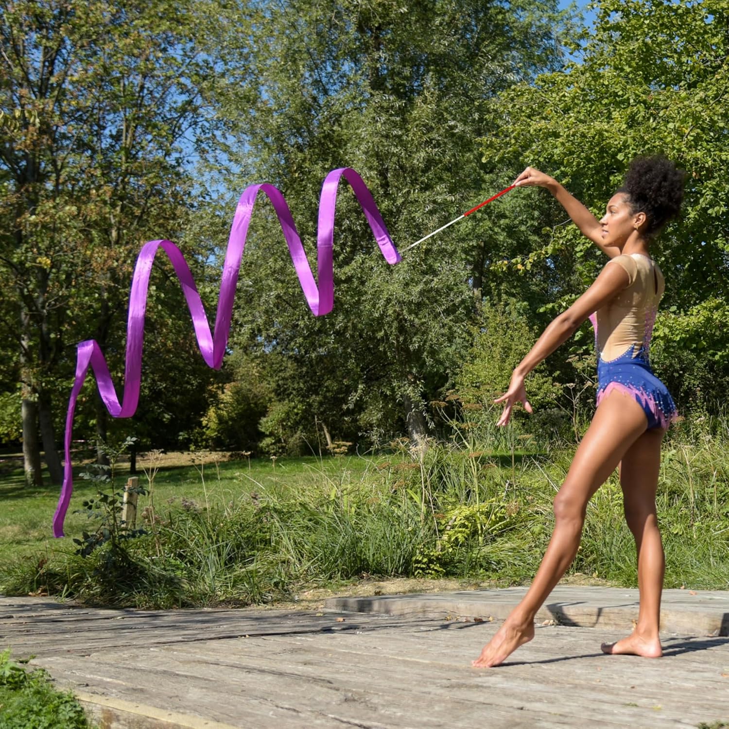 - Quality Material: the rhythmic gymnastics ribbon is made of soft satin material, lightweight and wear resistant, beautiful and bright colors printed on the surface will not easily fade; The ribbon stick is sturdy and hard to break, can serve you for a long term; The handle does not slip easily when twirling the ribbon; Metal buckle at the top of the stick provides flexible rotation for the ribbon