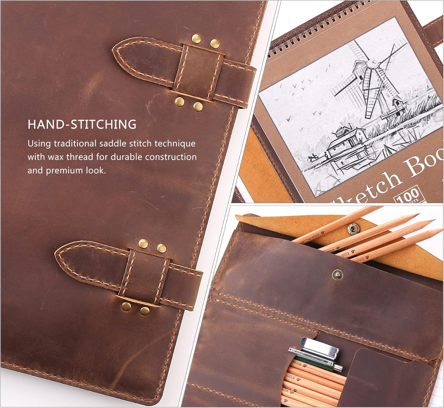 - BEAUTIFULLY HANDCRAFTED - This is a beautifully crafted and versatile sketchbook cover is entirely handmade from high-quality distressed genuine leather for durability and a premium feel. Over time the leather will develop a unique patina. Meanwhile, manual stitching with waxed thread complements to the retro vibe and provides enhanced durability.