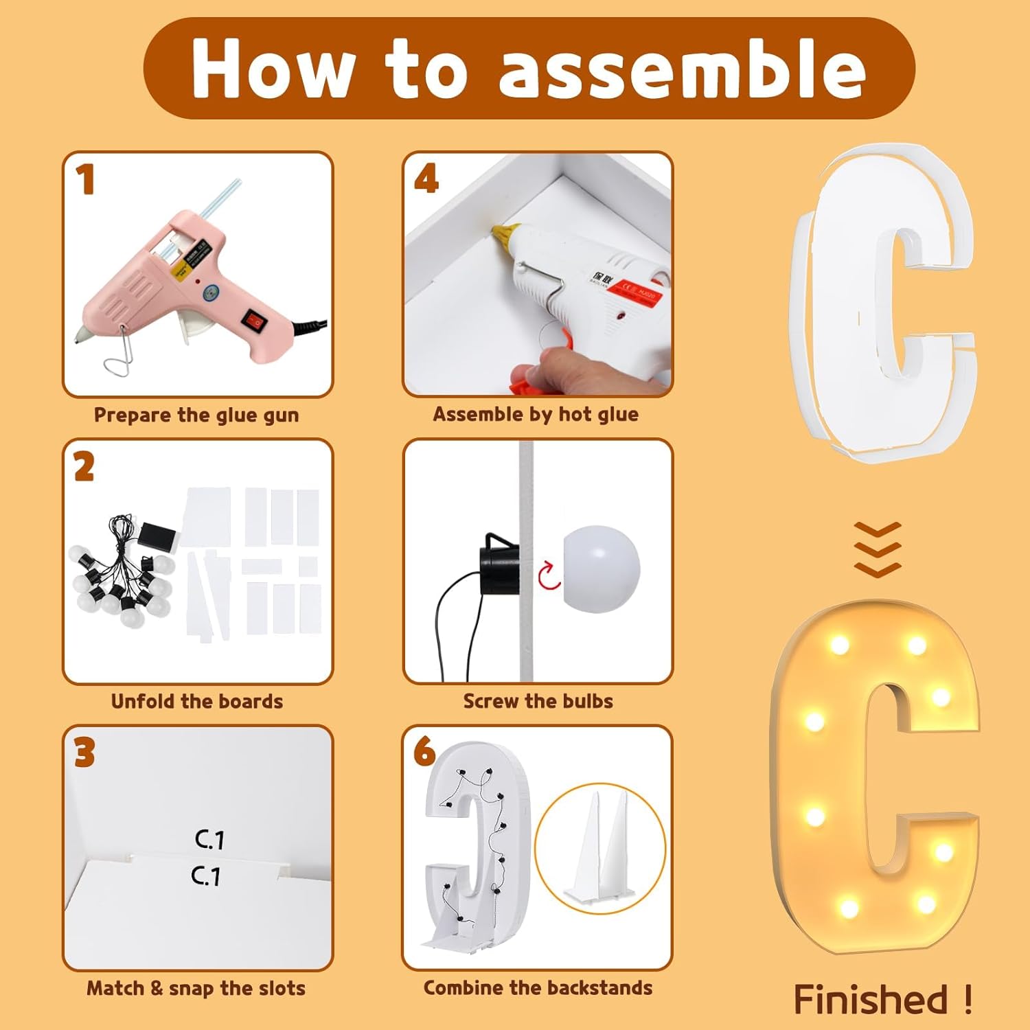 - Package Includes: A set of light up letters for party containing the pre-cut letter frames, a light string with several bulbs and assemble guiding manual. ( Noted: Glue gun and batteries are not included