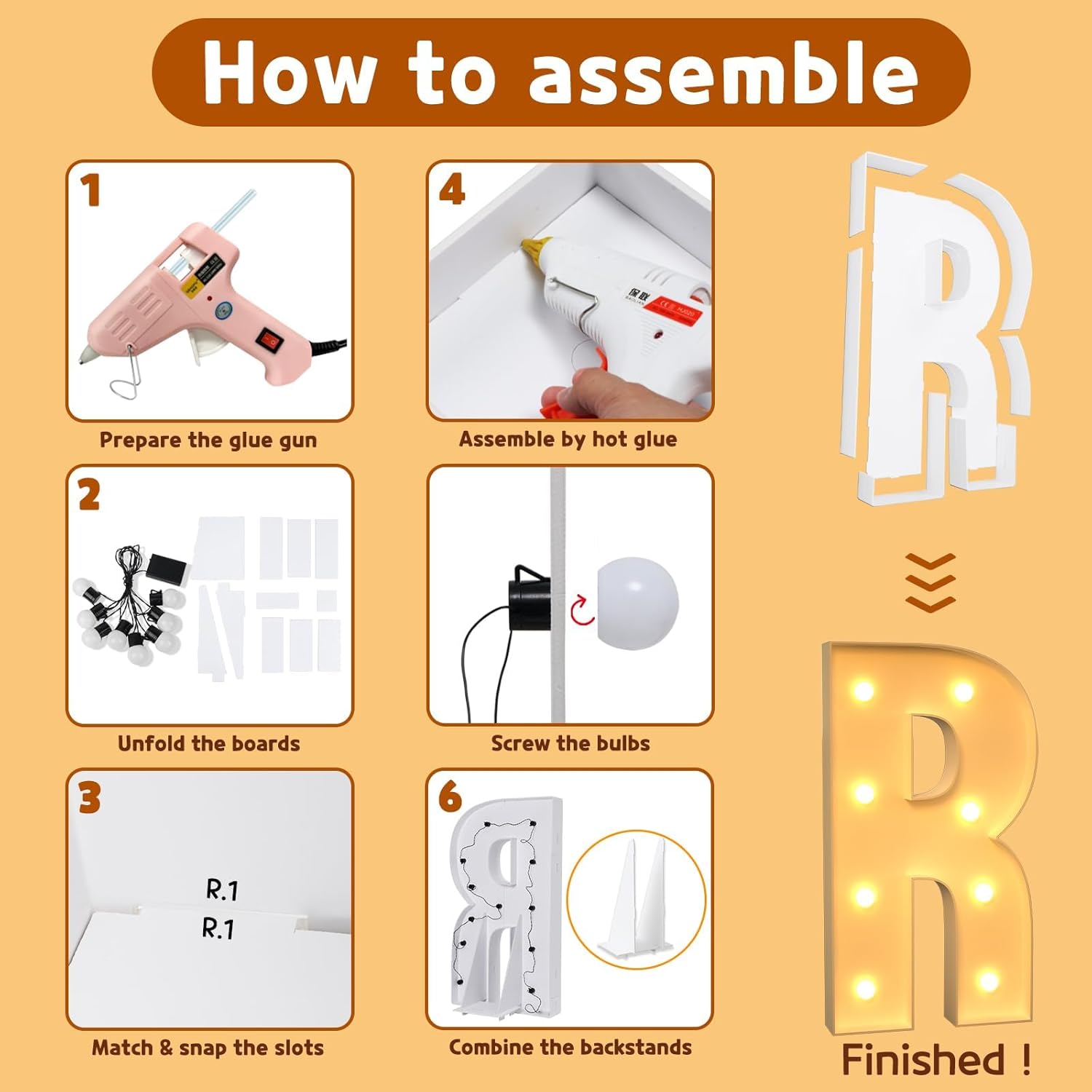 - Package Includes: A set of light up letters for party containing the pre-cut letter frames, a light string with several bulbs and assemble guiding manual. ( Noted: Glue gun and batteries are not included