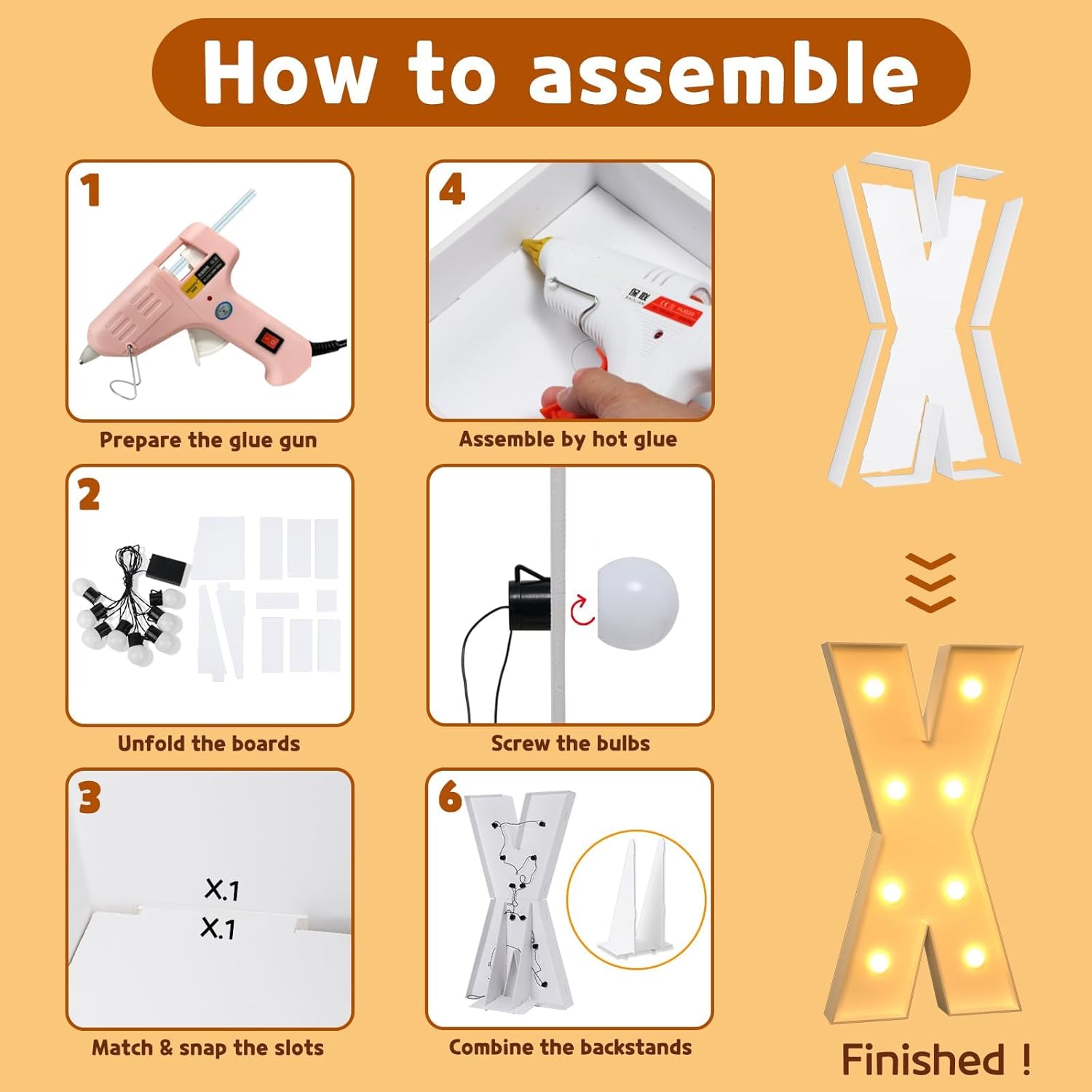 - Package Includes: A set of light up letters for party containing the pre-cut letter frames, a light string with several bulbs and assemble guiding manual. ( Noted: Glue gun and batteries are not included