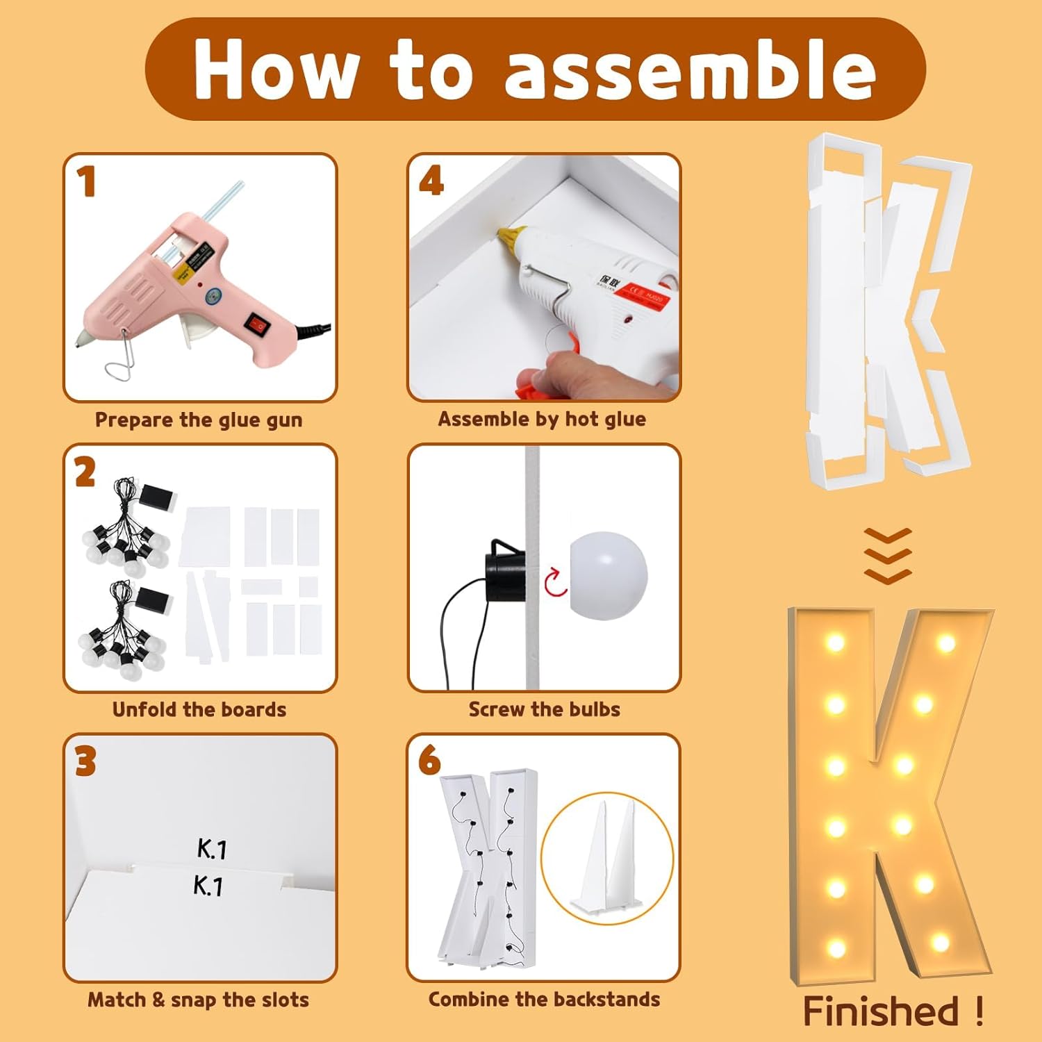 - Package Includes: A set of light up letters for party containing the pre-cut letter frames, a light string with several bulbs and the assemble instructions. ( Noted: Glue gun and batteries are not included