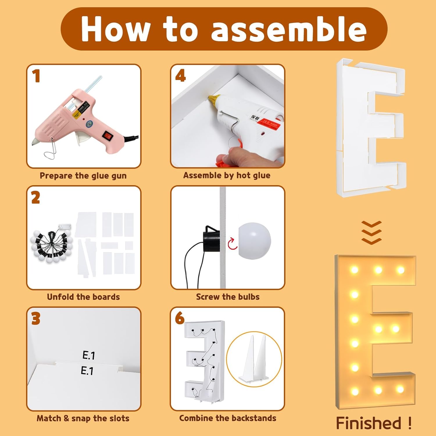 - Package Includes: A set of light up letters for party containing the pre-cut letter frames, a light string with several bulbs and the assemble instructions. ( Noted: Glue gun and batteries are not included