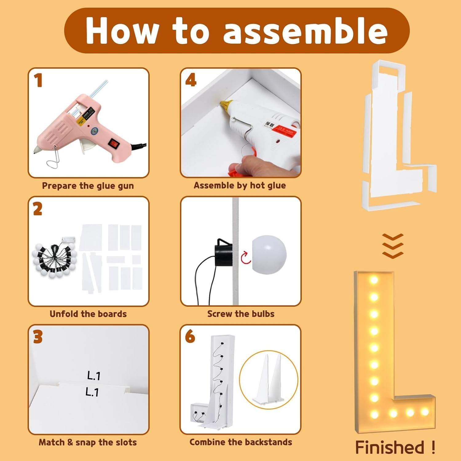 - Package Includes: A set of light up letters for party containing the pre-cut letter frames, a light string with several bulbs and the assemble instructions. ( Noted: Glue gun and batteries are not included