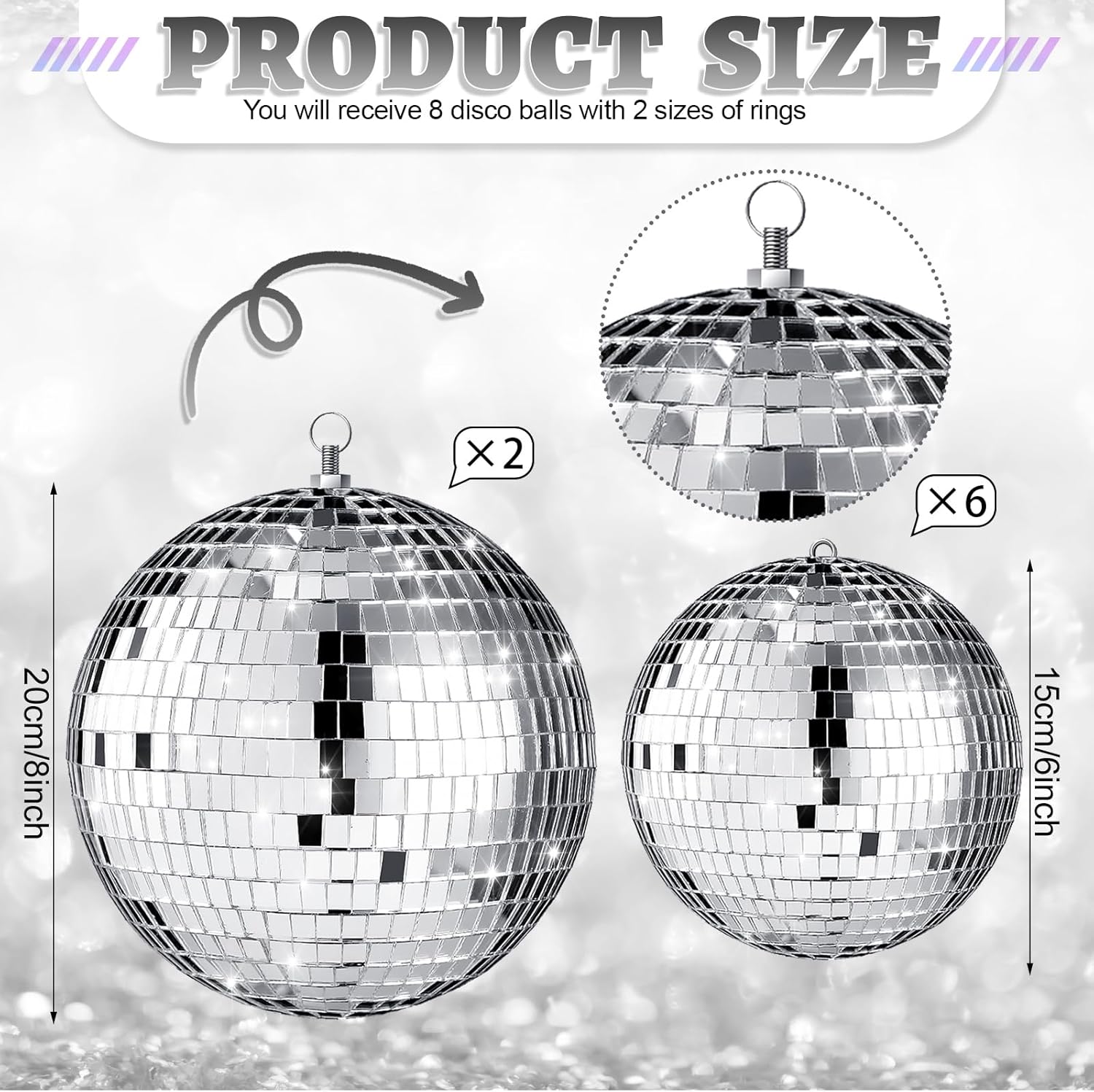 - Disco Ball Set: you will receive 8 pieces of disco balls with hanging rings in 2 sizes, respectively 4 piece of 8 inches large disco ball, 4 pieces of 6 inches middle disco balls, you can use them in combination or individually