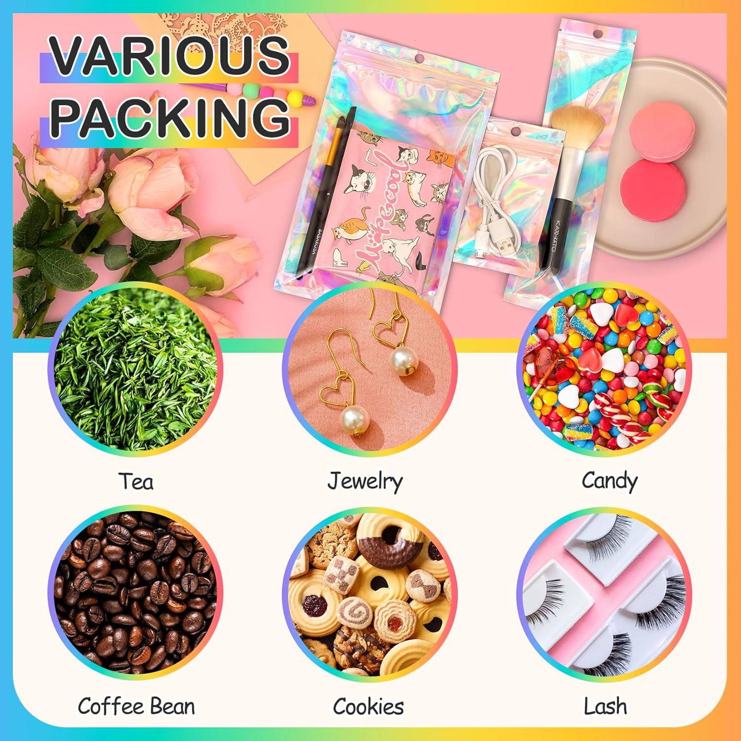 - 【Wide Use Zipper Bags】-Our cute zipper bags come in a range of sizes,perfect mylar zipper bags for food storage,serving as a party favor bag for coffee beans,tea,nuts,cookies,Lollipop candy,gummy,etc,suitable for other small business supply for store pen,beads,brushes,Jewelry,eyelashes,lipgloss,etc,also good as small gift wrapping baggies with zipper reusable.